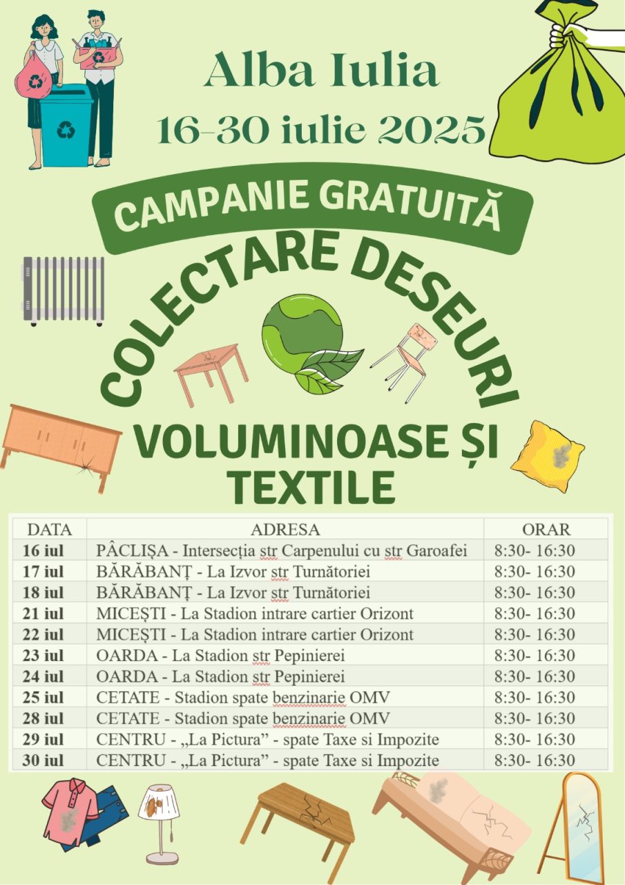 În perioada 16-30 iulie 2025, se va desfășura campania de colectare GRATUITĂ a deșeurilor voluminoase și textile menajere de pe raza municipiului Alba Iulia, conform graficului. Dorim să reamintim cetățenilor că astfel de deșeuri NU se depozitează în sau lângă recipientele de colectare a deșeurilor menajere, iar abandonarea acestora în locuri neamenajate este strict interzisă. Soluția legală și gratuită de debarasare a acestor deșeuri este predarea lor la containerele speciale.