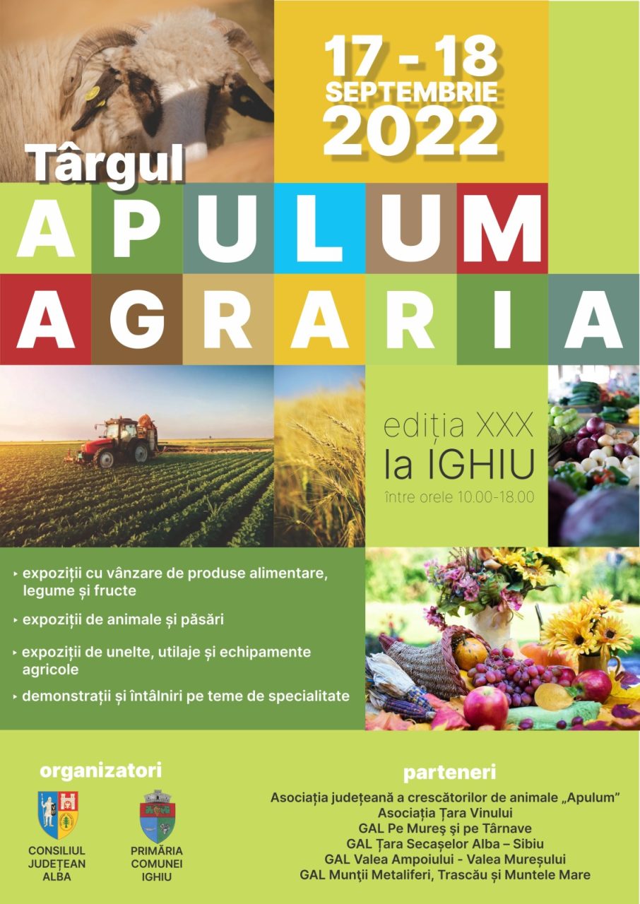 Ca în fiecare an, începutul toamnei este dedicat celui mai important eveniment de promovare a agriculturii judeţului Alba. Ajuns la cea de-a XXX-a ediţie, Târgul APULUM AGRARIA se va desfășura în perioada 17-18 septembrie 2022, în comuna Ighiu, în spaţiul expoziţional din cadrul Târgului de animale, situat pe DJ 107 H.