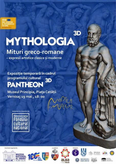 Expoziția temporară MYTHOLOGIA 3D. Mituri greco-romane – expresii artistice clasice și moderne, reprezintă primul eveniment organizat în cadrul programului cultural multianual PANTHEON 3D cofinanțat de A.F.C.N. și implementat de Muzeul Național al Unirii Alba Iulia în perioada 2018-2019.