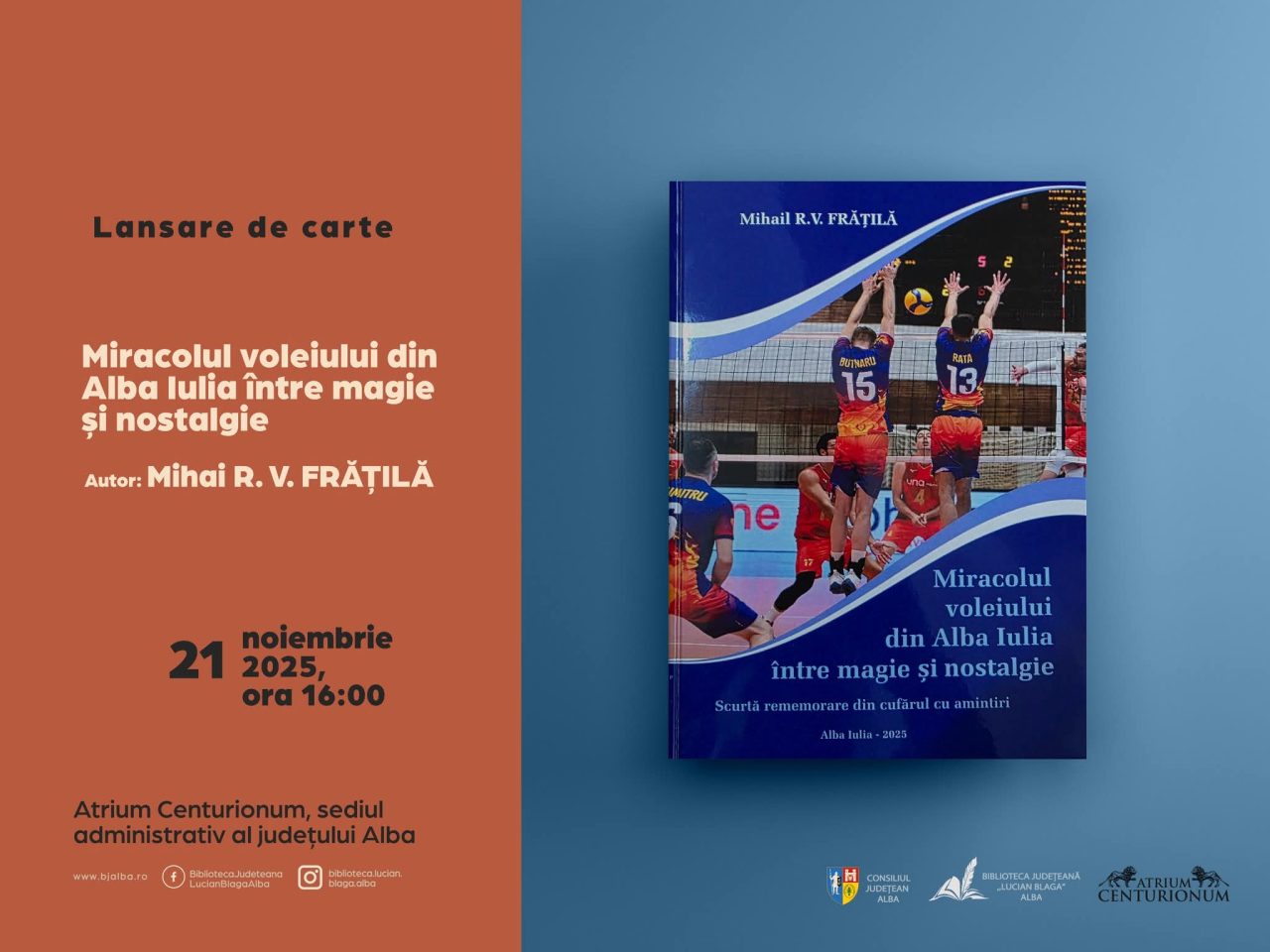 Consiliul Județean Alba și Biblioteca Județeană „Lucian Blaga” Alba îi invită pe toți iubitorii sportului să ia parte la lansarea unui nou volum semnat de profesorul Mihai Frățilă, intitulat sugestiv „ Miracolul voleiului din Alba Iulia între magie și nostalgie.