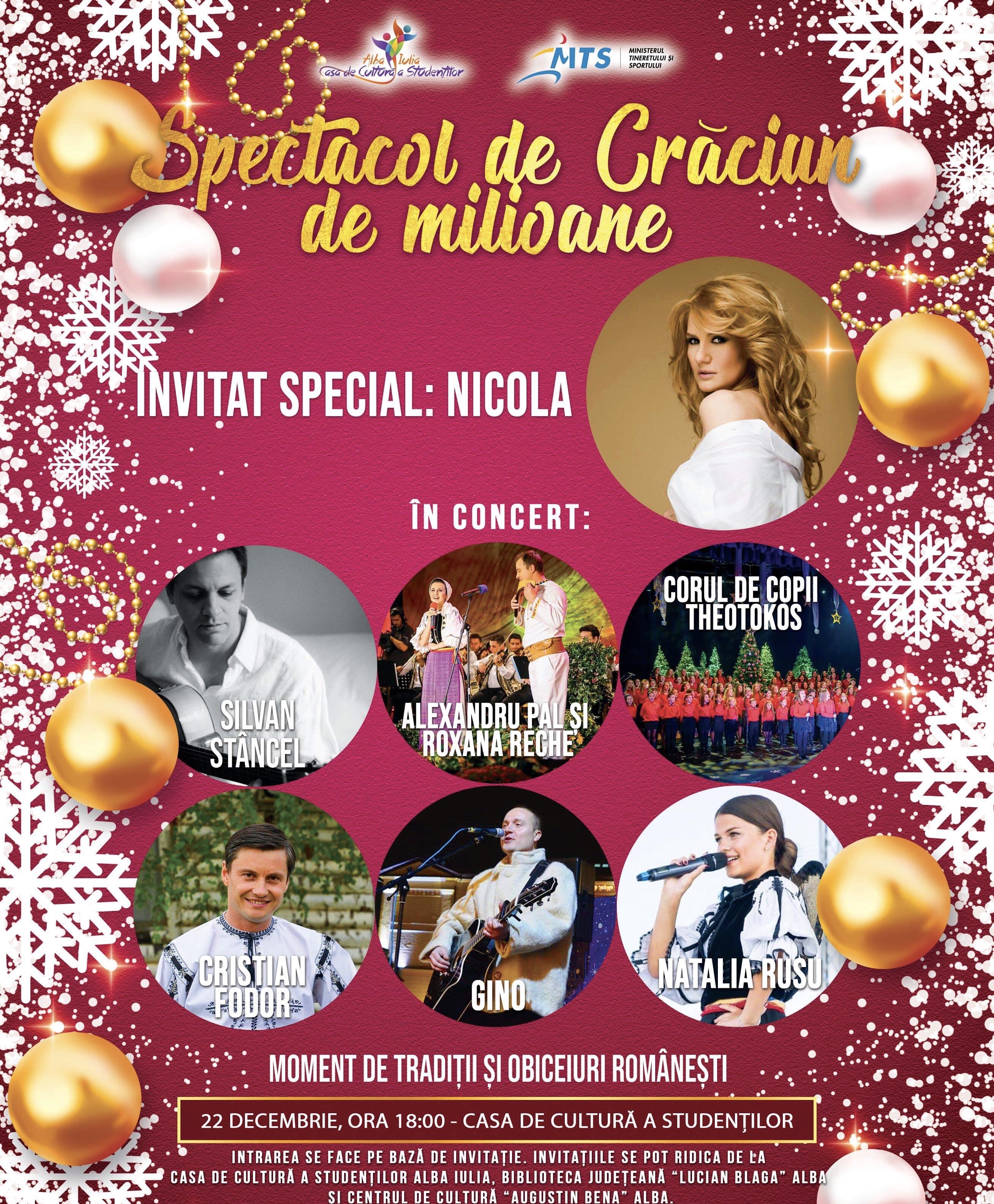 Sâmbătă, 22 decembrie, ora 18:00, sunteți așteptați la un eveniment care să vă ducă tot mai aproape de Sărbătoarea Nașterii Domnului. Este vorba despre “Spectacol de Crăciun de milioane!”, eveniment ce va avea loc pe scena Casei de Cultură a Studenților din Alba Iulia.