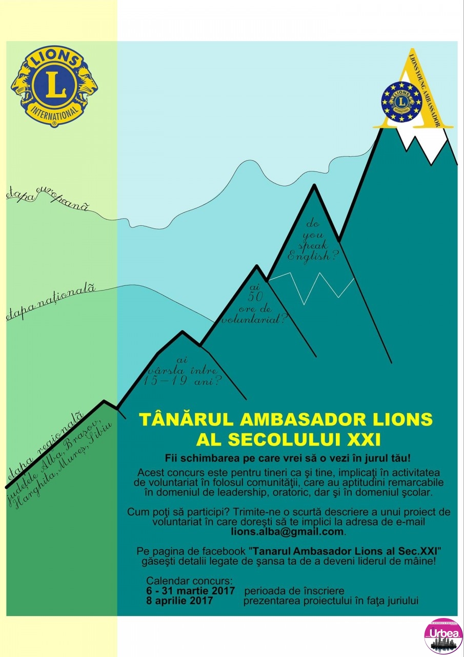 Lions Club Alba Iulia invită liceenii cu experienţă în voluntariat să participe la concursul „Tânărul Ambasador Lions al Secolului XXI”. Concursul premiază cele mai bune proiecte de voluntariat derulate în folosul comunităţii. Înscrierea se poate face până în 31 martie 2017, prin transmiterea unei scurte descrieri a ideii de proiect la adresa de e-mail lions.alba@gmail.com.