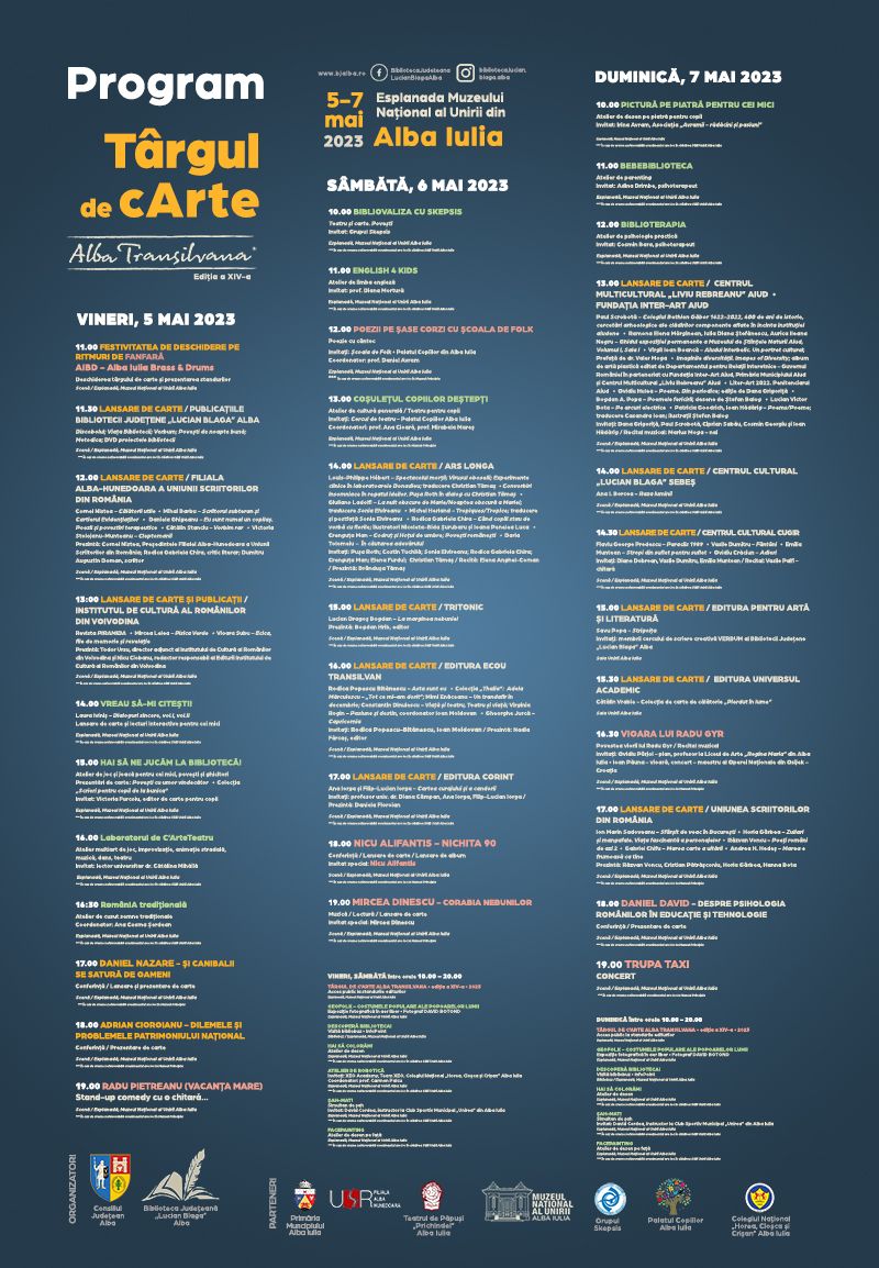 În perioada 5-7 mai 2023, Consiliul Județean Alba și Biblioteca Județeană „Lucian Blaga” Alba, alături de parteneri, vă invită în inima Cetății Alba Carolina, pe esplanada Muzeului Național al Unirii din Alba Iulia, la cea de-a XIV-a ediție a Târgului de cArte Alba Transilvana.