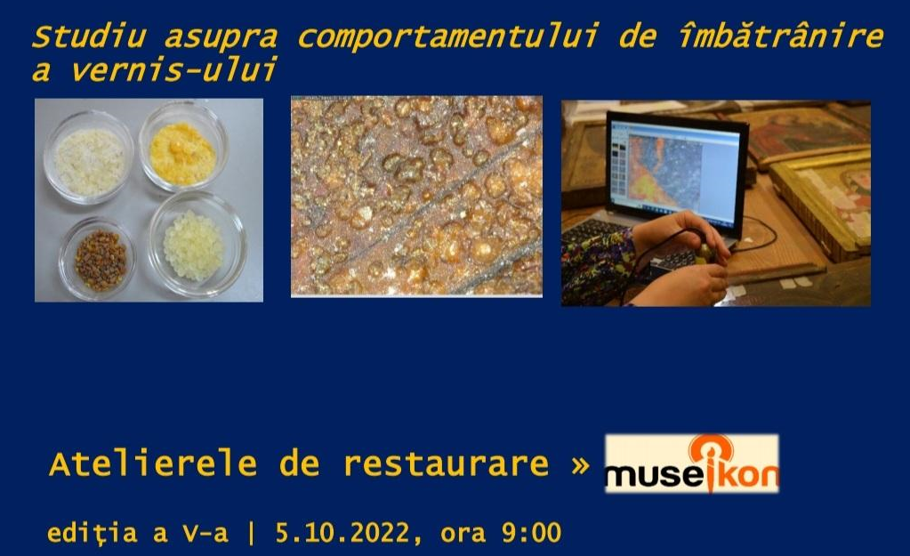 Miercuri, 5 octombrie 2022, începând cu ora 9:00, la Museikon/ Muzeul Național al Unirii Alba Iulia se va desfășura online, via zoom, partea a doua a Atelierelor de Restaurare Museikon, ediția a V-a, cu tema „Vernis-urile: probleme de conservare și restaurare. Studierea comportamentului de îmbătrânire a vernis-ului”. Va fi prezentat, cu această ocazie, stadiul actual al cercetării privind studierea comportamentului de îmbătrânire a vernis-ului.