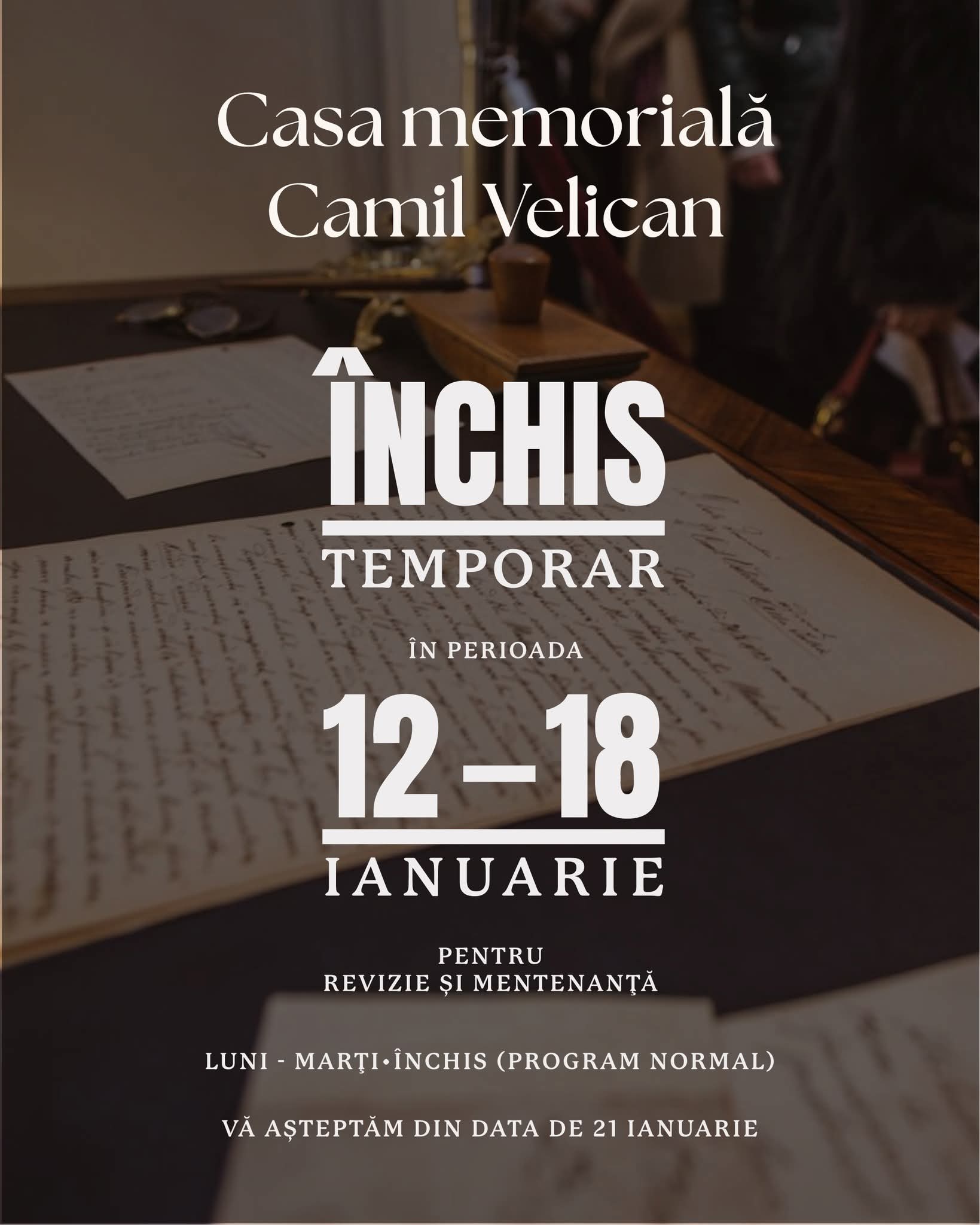 „În perioada 12–18 ianuarie, Casa memorială Camil Velican își ia un scurt răgaz.