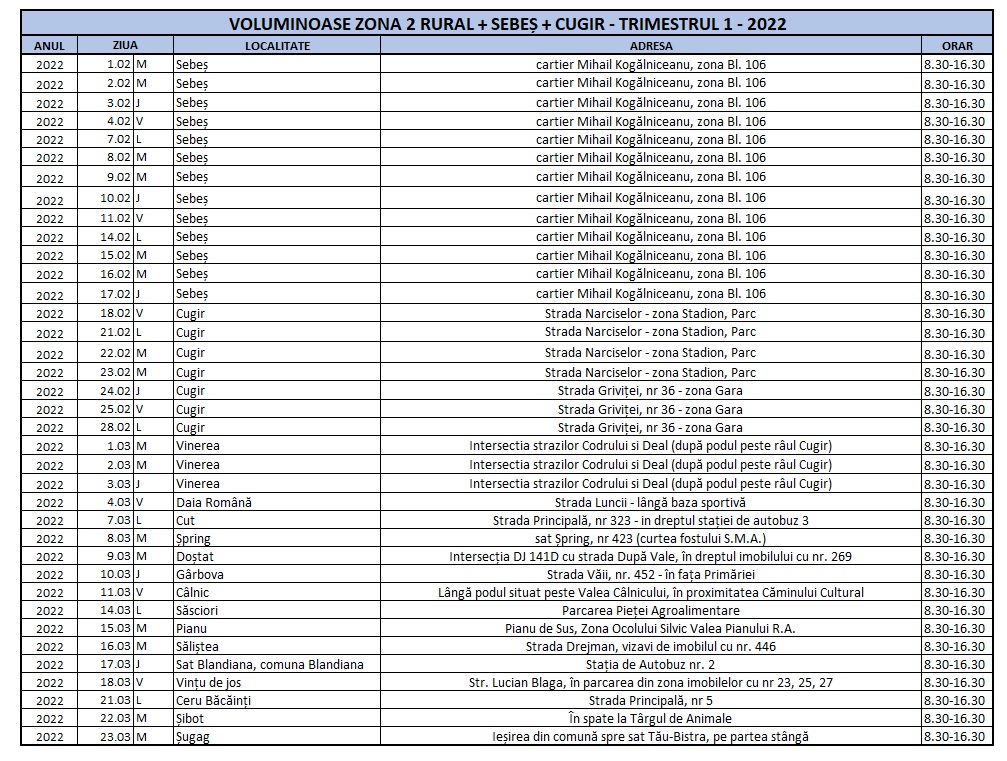 În perioada 01 februarie – 23 martie 2022 se desfăşoară o campanie dedicată colectării deșeurilor voluminoase în zona 2 a judeţului Alba. Sunt incluse orașele Sebeș, Cugir, respectiv comunele Daia,Cut, Șpring, Doștat, Gârbova, Câlnic, Săsciori, Pianu, Săliștea, Blandiana, Vințu de Jos, Ceru-Băcăinți, Șibot, Șugag