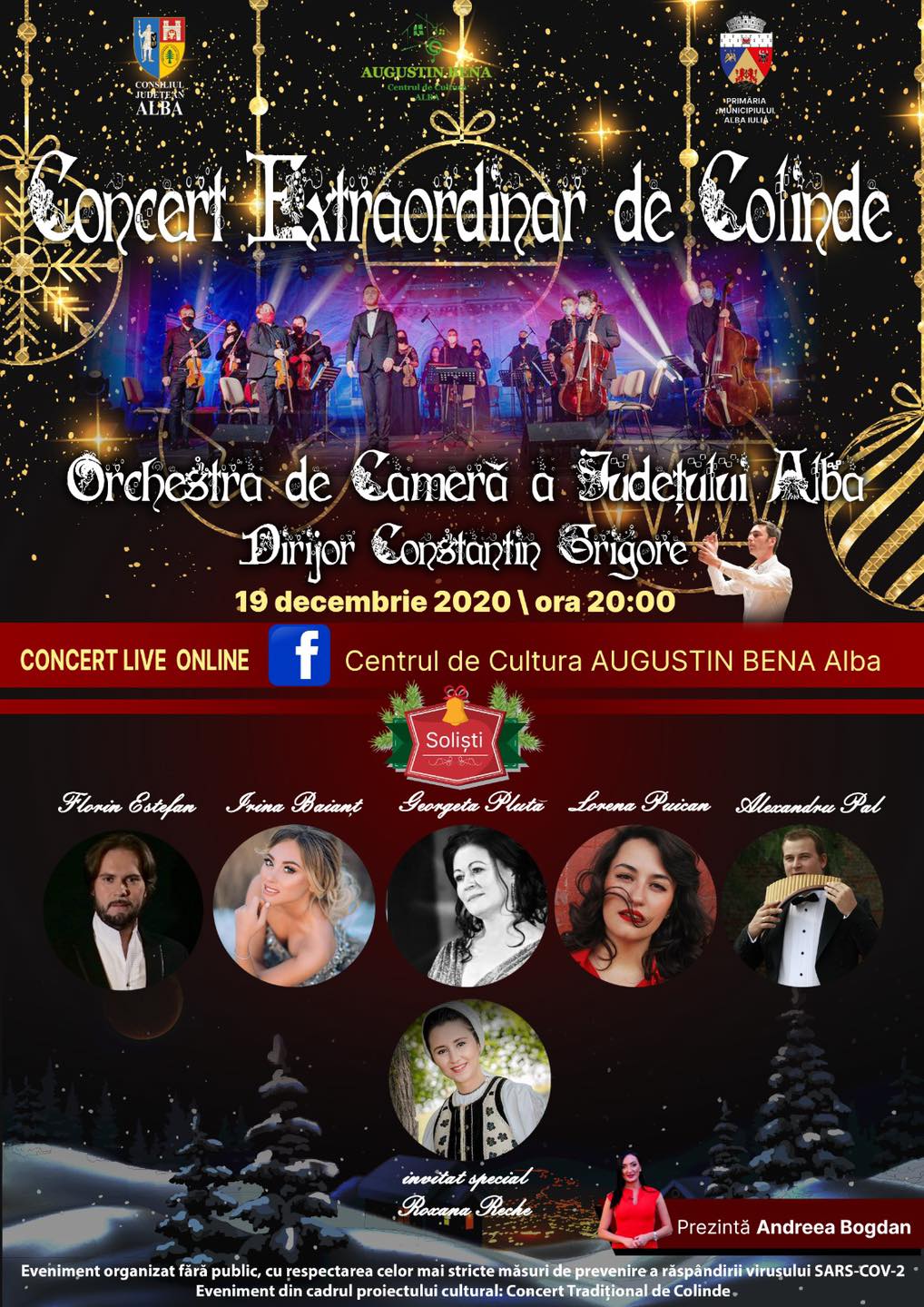 Centrul de Cultură „Augustin Bena” Alba organizează, sâmbătă, 19 decembrie 2020, începând cu ora 20:00, un concert extraordinar de colinde, eveniment care se va desfășura fără public și care va fi transmis live on-line.