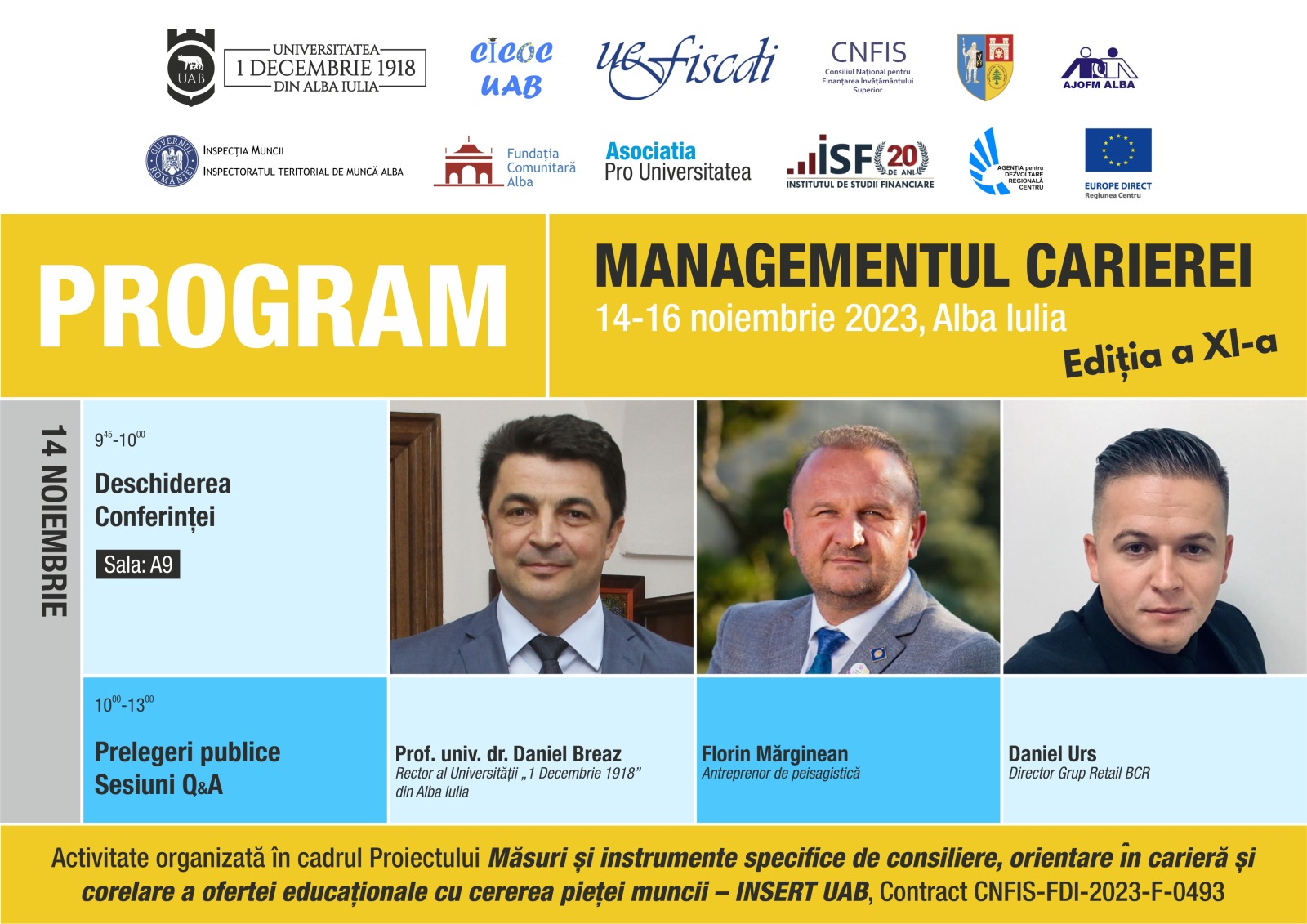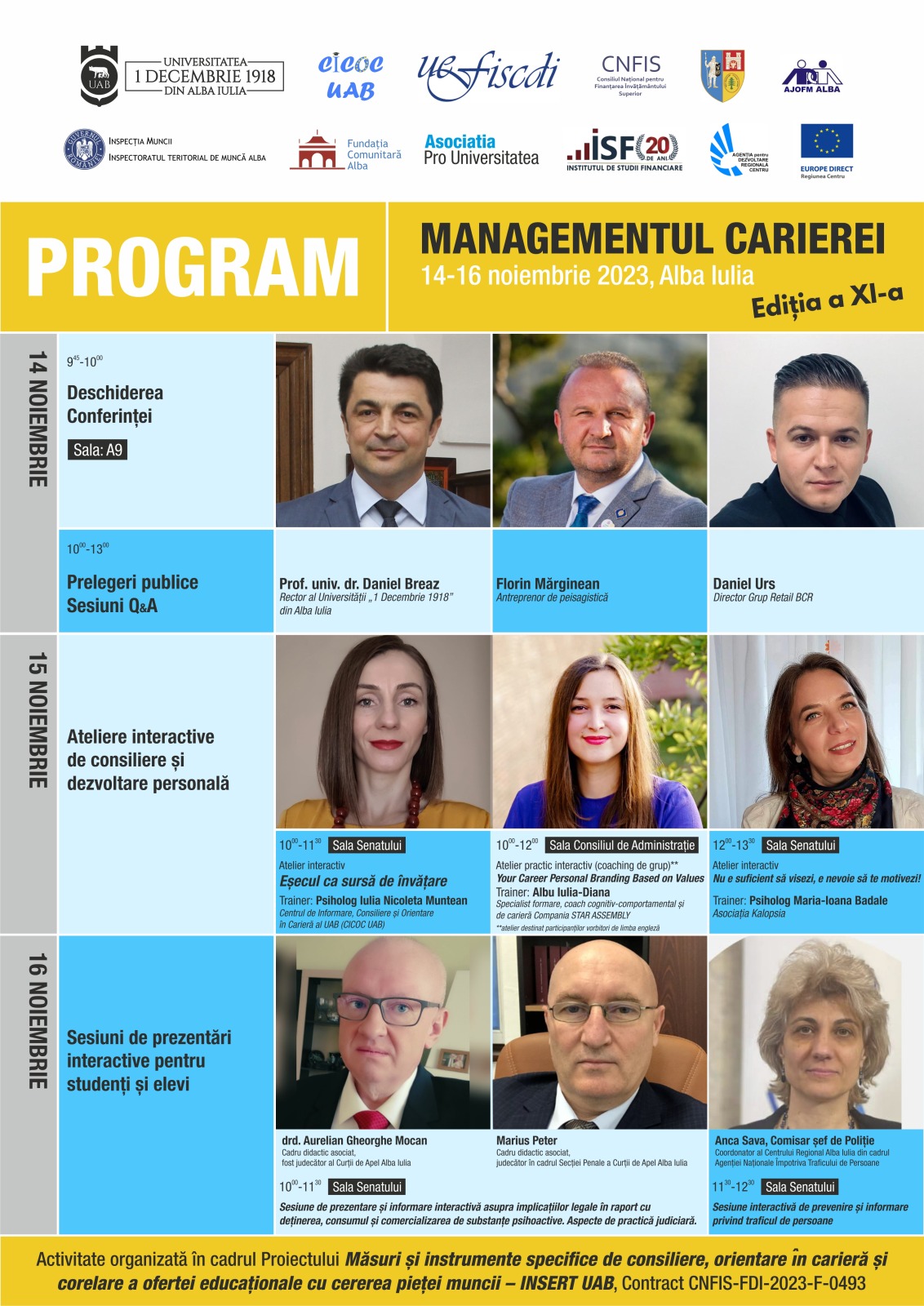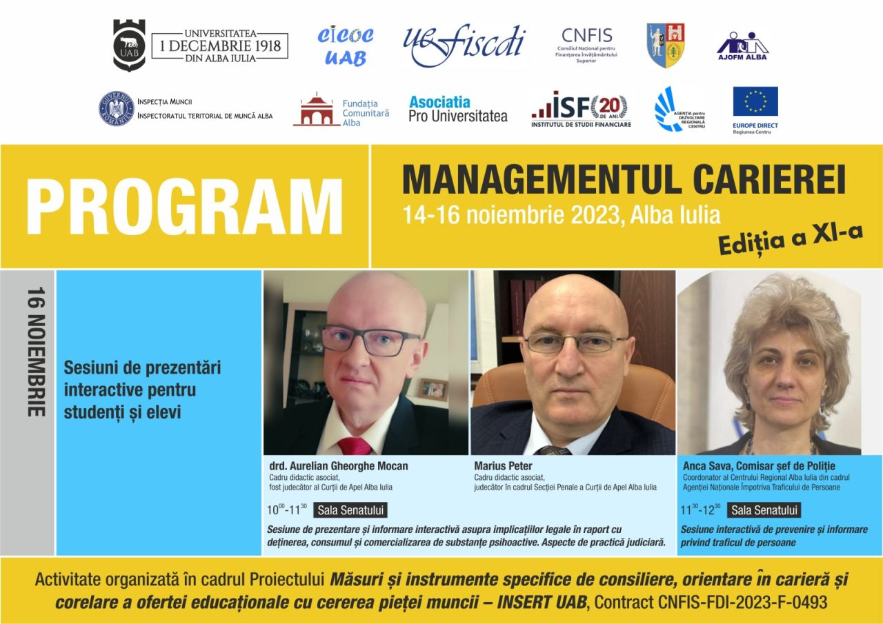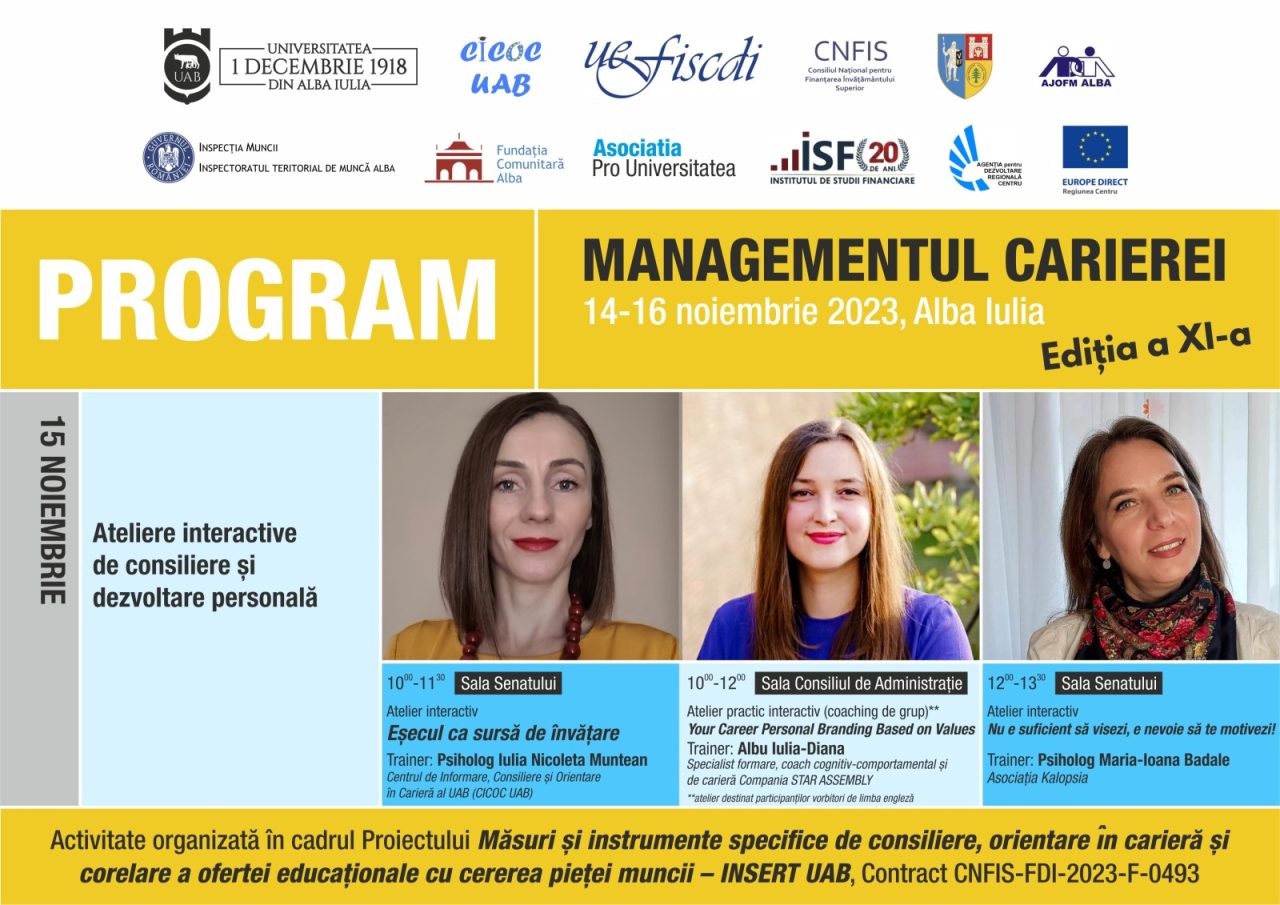 Săptămâna viitoare, în perioada 14-16 noiembrie a.c., la Universitatea „1 Decembrie 1918” din Alba Iulia se va desfășura a XI-a ediție a Conferinței Managementul Carierei, eveniment organizat de către Centrul de Informare, Consiliere și Orientare în Carieră al Universității „1 Decembrie 1918” din Alba Iulia (CICOC UAB), în parteneriat cu Consiliul Județean Alba, Agenția Județeană de Ocupare a Forței de Muncă Alba, Inspectoratul Teritorial de Muncă Alba, Fundația Comunitară Alba, Asociația Pro Universitatea, Institutul de Studii Financiare, Agenția de Dezvoltare Regională Centru, Centrul Europe Direct Regiunea Centru.