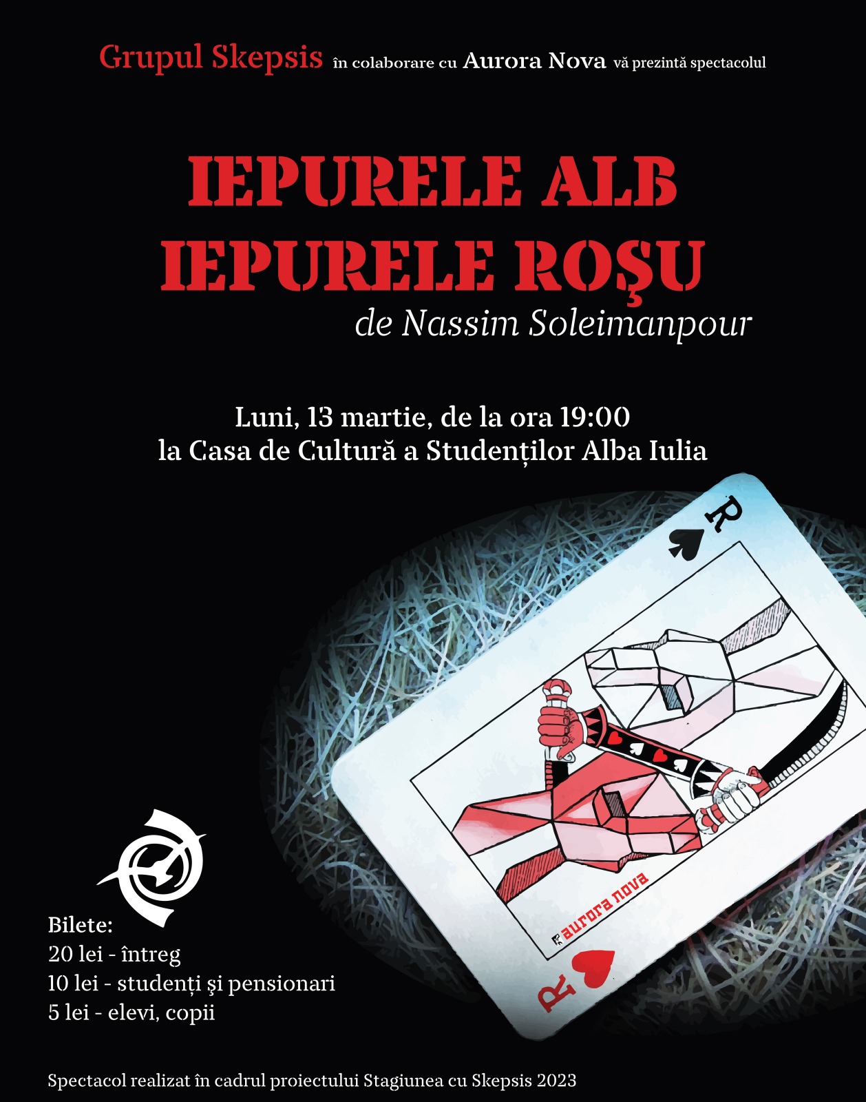 Pe data de 13 Martie 2023, ora 19.00, la Casa de Cultură a Studenților Alba Iulia, Grupul Skepsis se alătură celor 80 de teatre și companii de teatru din 32 de țări, de pe 6 continente, care vor prezenta publicului piesa Iepurele Alb, Iepurele Roșu, de Nassim Soleimanpour, cunoscut autor iranian !