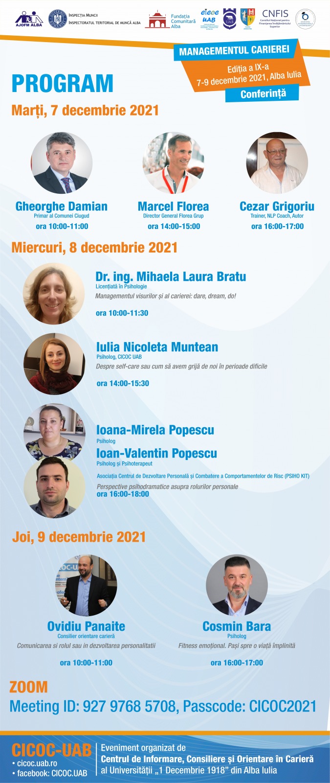 Toate activitățile vor avea loc pe platforma ZOOM, accesul va fi liber, pe baza de conectare la linkul unic de înregistrare: Join Zoom Meeting