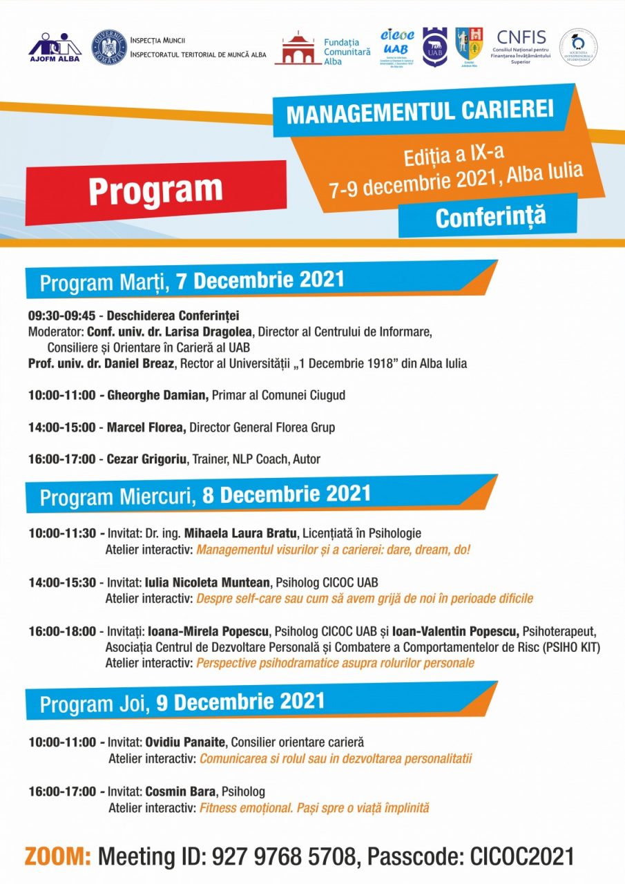 „Managementul Carierei” este cel mai mare eveniment de dezvoltare personală și carieră, derulat anual, la Universitatea „1 Decembrie 1918” din Alba Iulia, pentru studenți, elevi, absolvenți, precum și pentru toate categoriile de persoane interesate de dezvoltare personală și profesională. Conferința este organizată de Centrul de Informare, Consiliere și Orientare în Carieră (CICOC-UAB), coordonat de conf. univ. dr. Larisa Dragolea