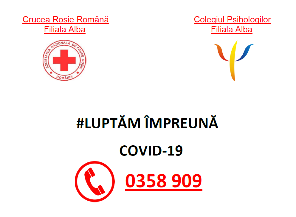 În contextul răspândirii infecției cu Coronavirus COVID-19 și al stării de îngrijorare generate în rândul populației, Colegiul Psihologilor Filiala Alba se alătură Filialei de Cruce Roșie a judeţului Alba prin oferirea de suport psihologic telefonic persoanelor care au nevoie de sprijin emoțional pentru a depăşi stările de anxietate şi panică cu care se pot confrunta în această perioadă.