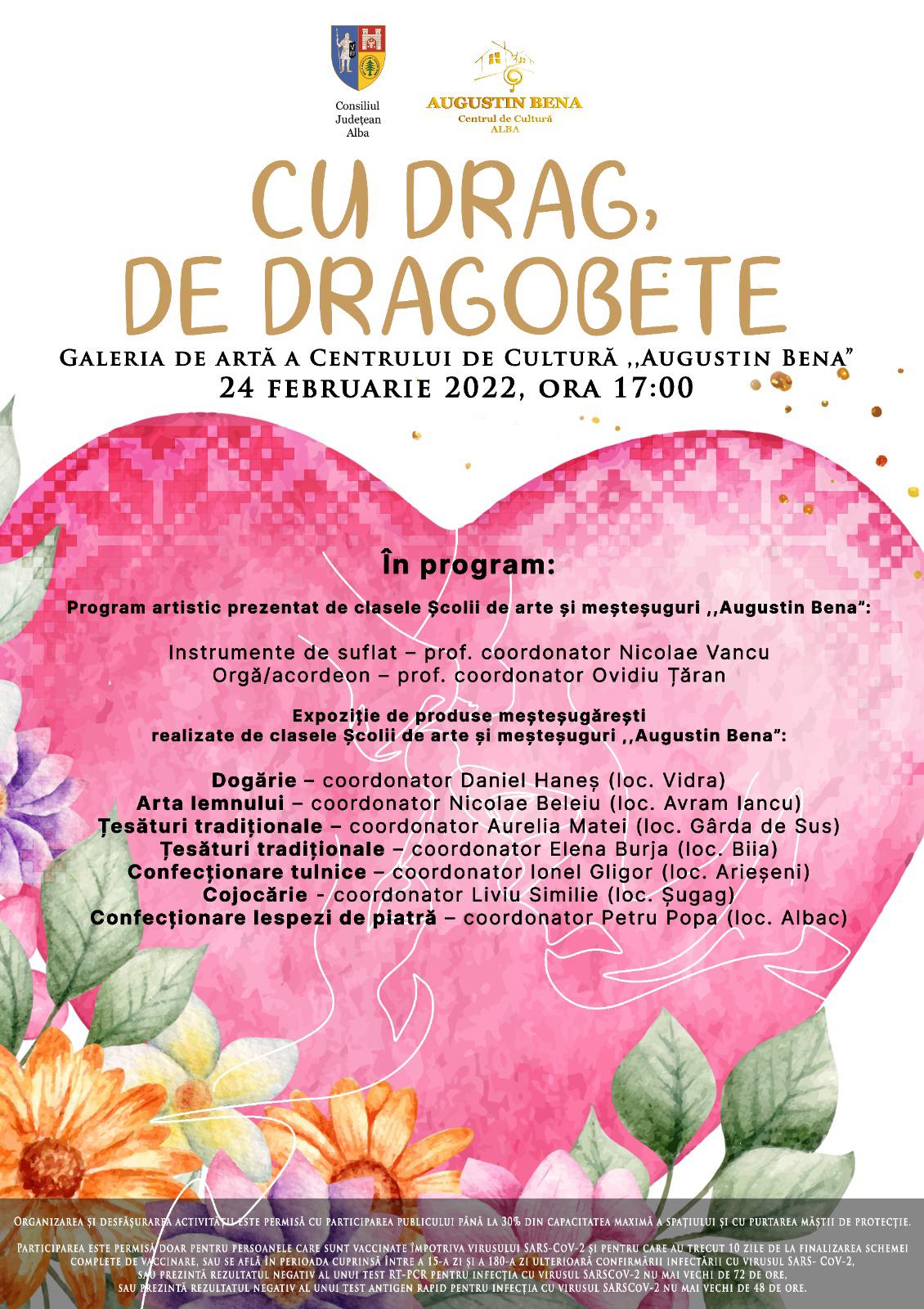 Centrul de Cultură „Augustin Bena” Alba organizează, joi, 24 februarie 2022, evenimentul cultural-artistic „Cu drag, de Dragobete”, în cadrul căruia își vor da concursul cursanții Școlii de Arte și Meșteșuguri din cadrul instituției