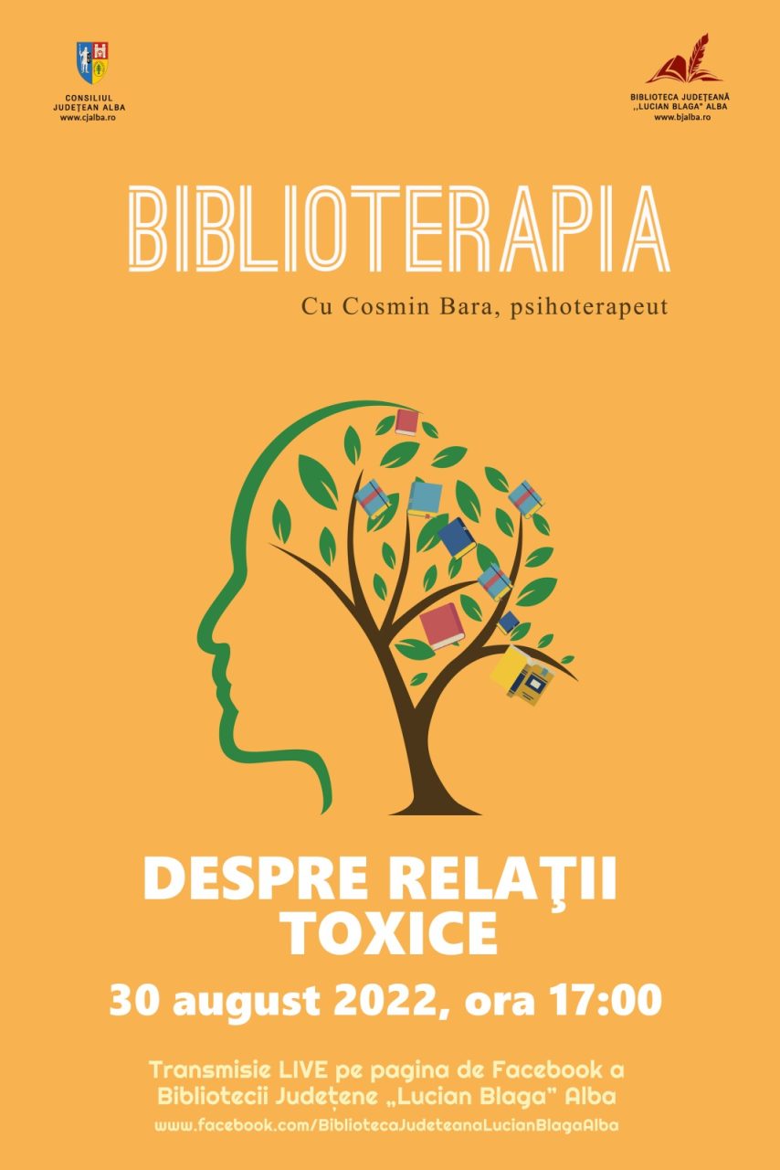 Marți, 30 august 2022, Biblioteca Județeană „Lucian Blaga” Alba găzduiește o nouă activitate în cadrul proiectului 3.30 Biblioterapia, un proiect cultural ce se derulează sub forma unor ateliere de psihologie practică, pentru viața de zi cu zi, promovând totodată colecția de carte de specialitate a bibliotecii.