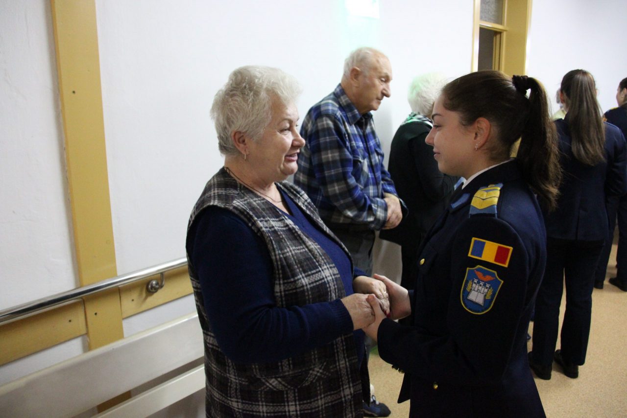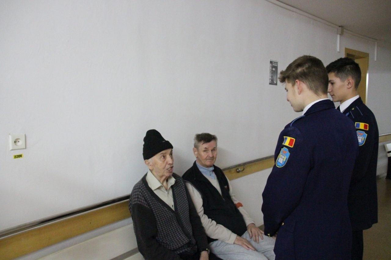 Prima oprire a fost la Căminul pentru persoane vârstnice unde elevii militari au interpretat mai multe colinde și au stat de vorbă cu bunicii, făcându-i pentru câteva clipe, să uite de greutățile bătâneții și dorul de nepoți.