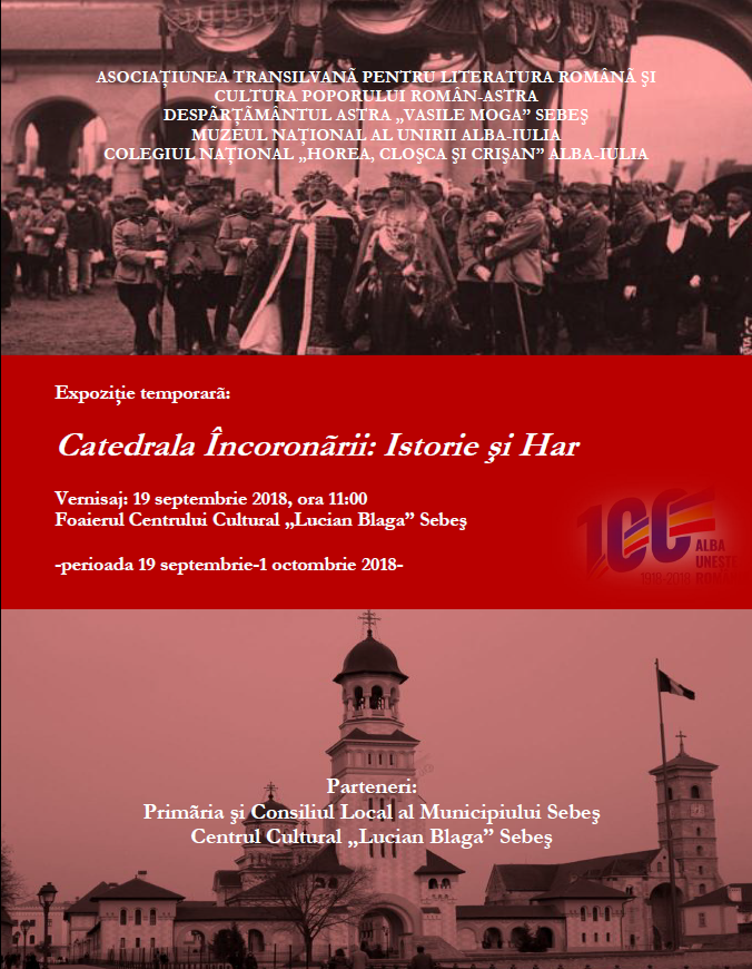Miercuri, 19 septembrie 2018, la ora 11:00, în Foaierul Centrului Cultural „Lucian Blaga” Sebeş, va fi vernisată expoziţia temporară „Catedrala Încoronării: Istorie şi Har” (custode: muzeograf Ionela Simona Mircea). Evenimentul…