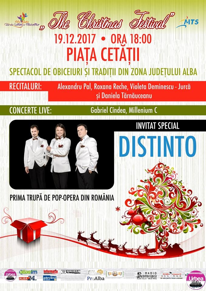 19 decembrie: The Christmas Festival, în Piaţa Cetăţii, din Alba Iulia. Concert Distinto şi spectacol folcloric