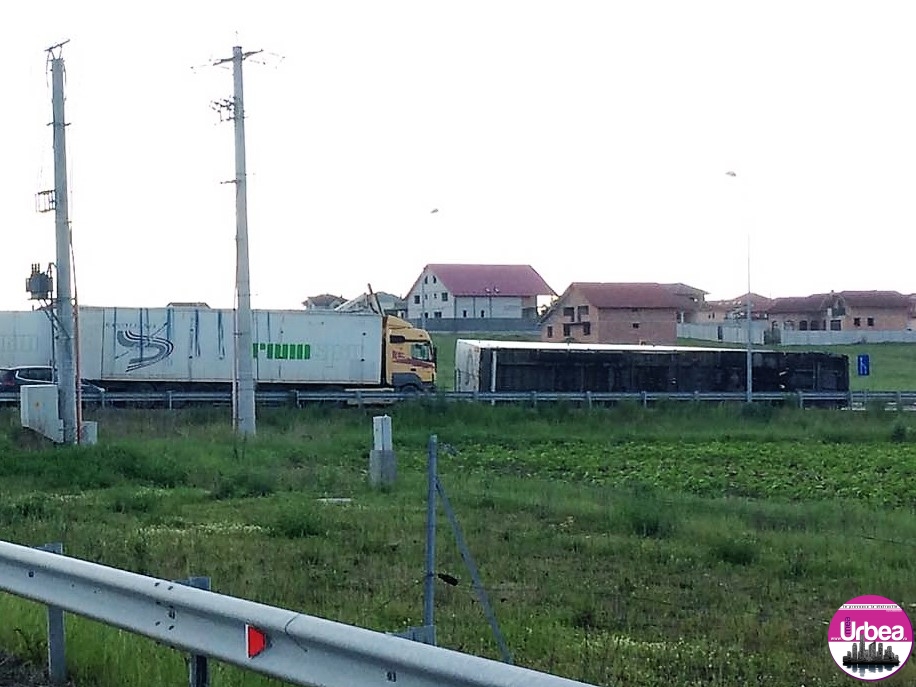 FOTO: Un Tir încărcat cu pal s-a răsturnat pe DN 1, la ieșirea de pe Autostrada Sibiu-Deva. Traficul a fost îngreunat timp de trei ore