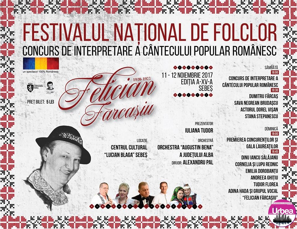 10-12 NOIEMBRIE: Festivalul Naţional de Folclor „Felician Fărcaşiu” – Concurs de interpretare a cântecului popular românesc, la Sebeş. Programul evenimentului