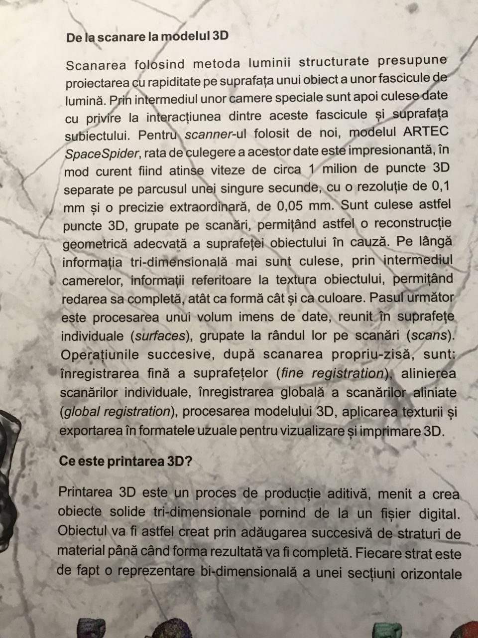 Scanarea folosind metoda luminii structurate presupune proiectarea cu rapiditate pe suprafața unui obiect a unor fascicule de lumină. Prin intermediul unor camere speciale sunt apoi culese date cu privire la interacțiunea dintre aceste fascicule și suprafața obiectului. Pentru scanner-ul folosit de noi, modelul ARTEC SpaceSpider, rata de culegere a acestor date este impresionantă, în mod curent fiind atinsă viteza de circa 1 milion de puncte 3D separate pe parcursul unei singure secunde cu o rezoluție de 0,1 mm.