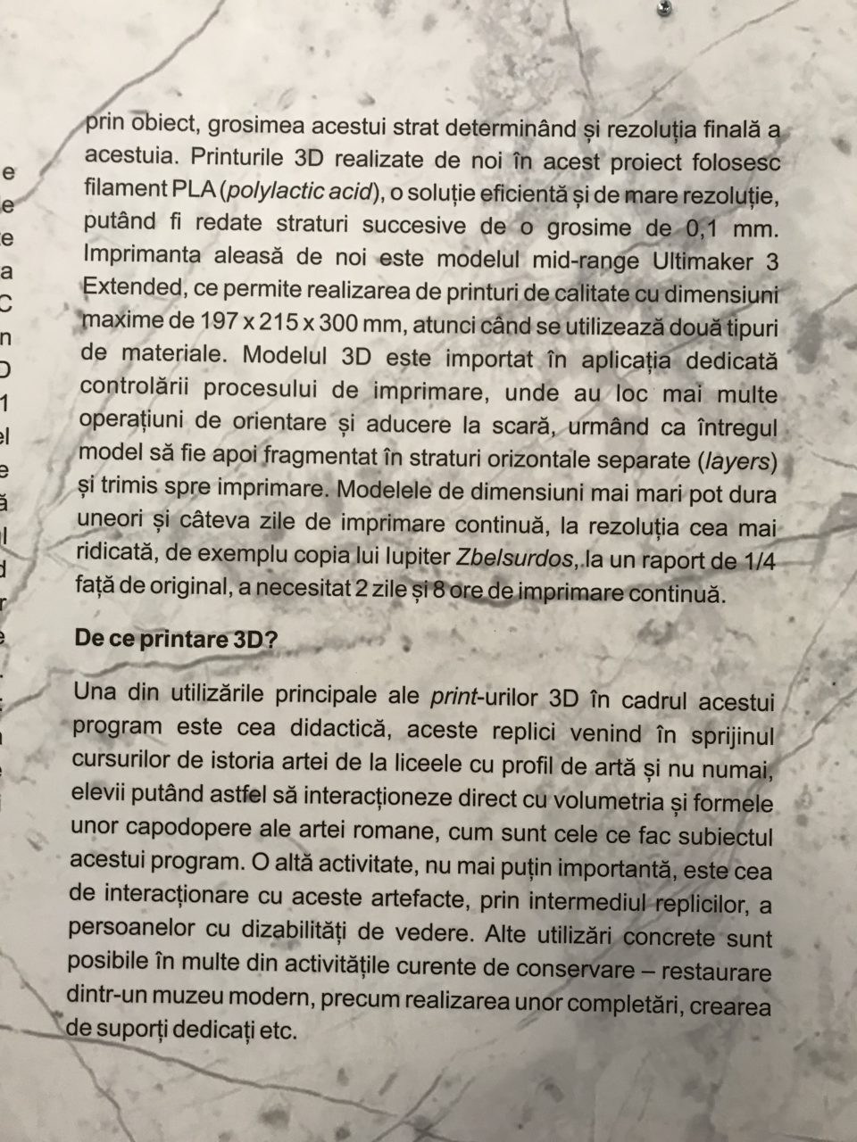De asemenea, în cadrul evenimentului publicul a putut admira atât sculptura romană cât şi replica ei, realizată prin imprimare 3D, în baza modelului obţinut din scanarea piesei cu ajutorul luminii structurate. Digitizarea sculpturii a fost efectuată în cadrul Programului Pantheon 3D, co-finanţat de Administraţia Fondului Cultural Naţional. Informaţii privind tehnica digitizării 3D şi importanţa documentării tridimensionale a patrimoniului cultural mobil vor fi oferite de dr. Călin Şuteu.
