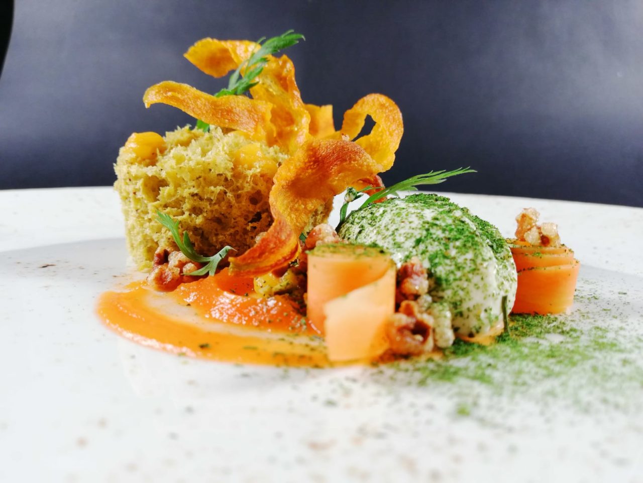 Gustarea rece a fost făcută din morcov și combinații și texturi de morcov: gel, piure, chips, morcov copt, frunze de morcov, combinate cu arpacaș expandat cu chimen , fistic și pandișpan de fistic și parfait din brânză fermentată. Am dorit să omagiez o legumă aparent simplă, și să gătesc ceva deosebit din ea. Trebuie să spun faptul că, deși am avut cărnuri și feluri mult mai elaborate în meniu, acest preparat a avut cel mai mare succes.
