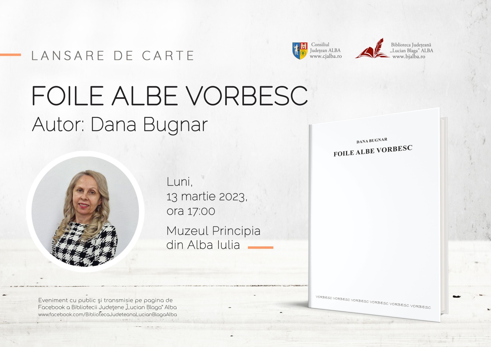 Biblioteca Județeană „Lucian Blaga” Alba și Consiliul Județean Alba vă invită luni, 13 martie 2023, începând cu ora 17.00, la Muzeul Principia din Alba Iulia, unde va avea loc evenimentul de lansare a unui nou volum de poezie, semnat de autoarea Dana Bugnar, Foile albe vorbesc.