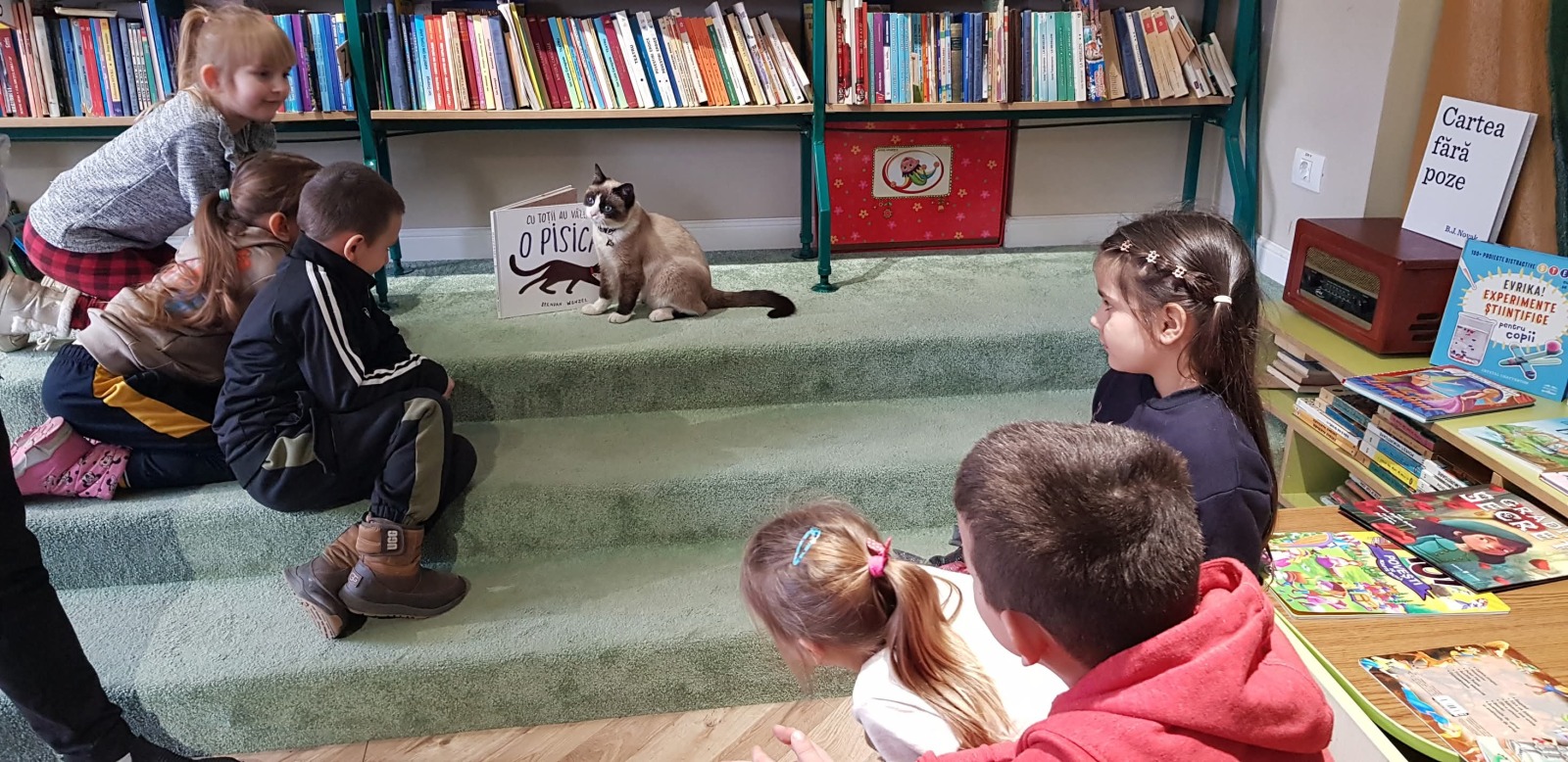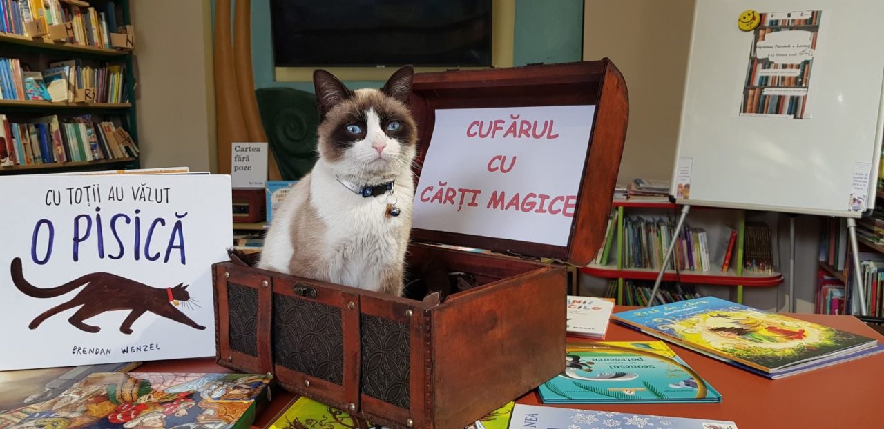 „După succesul cățelușei bibliotecare, a venit rândul unui pisoi iubitor, ieșit din cufărul cu cărți, să ofere afecțiune și să stârnească interesul copiilor.