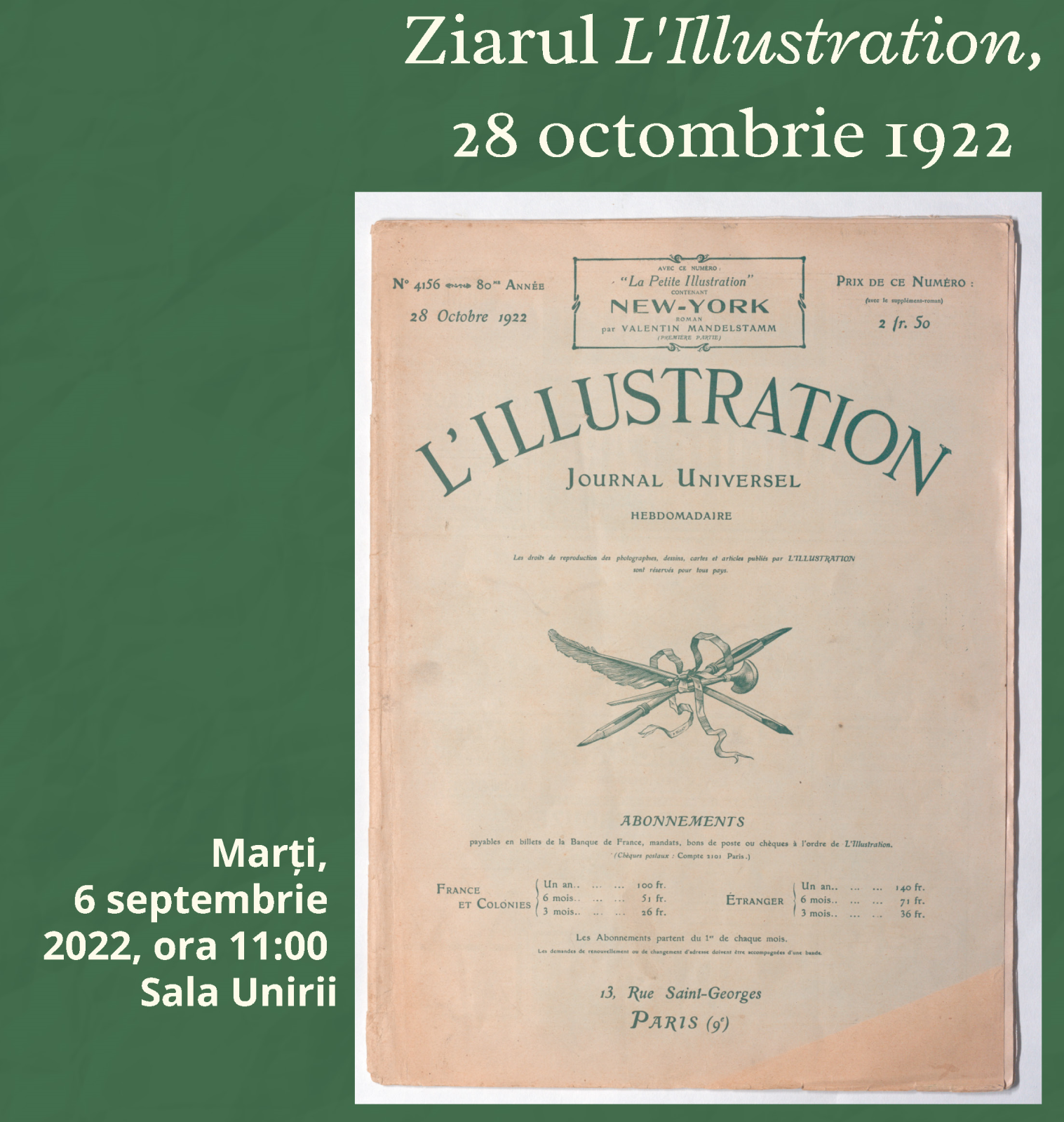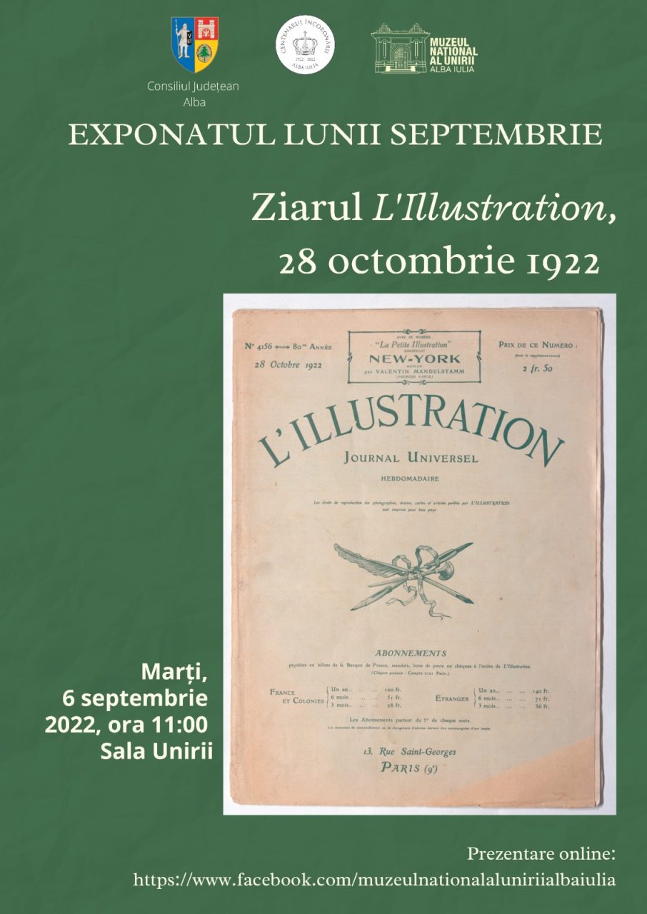 Marți, 6 septembrie 2022, ora 11, la Sala Unirii, va fi vernisat exponatul lunii septembrie, Ziarul L’Illustration din 28 octombrie 1922