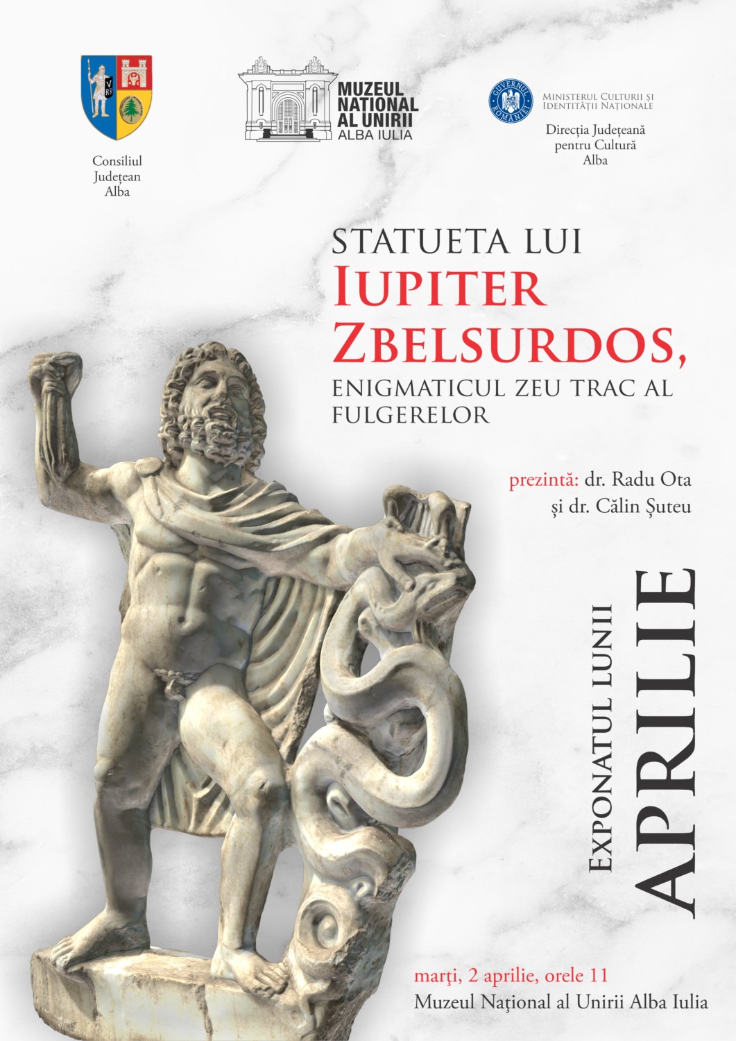 Marţi, 2 aprilie 2019, ora 11, la Muzeul Naţional al Unirii Alba Iulia va fi vernisat exponatul lunii aprilie: Statueta lui Iupiter Zbelsurdos, enigmaticul zeu trac al fulgerelor.