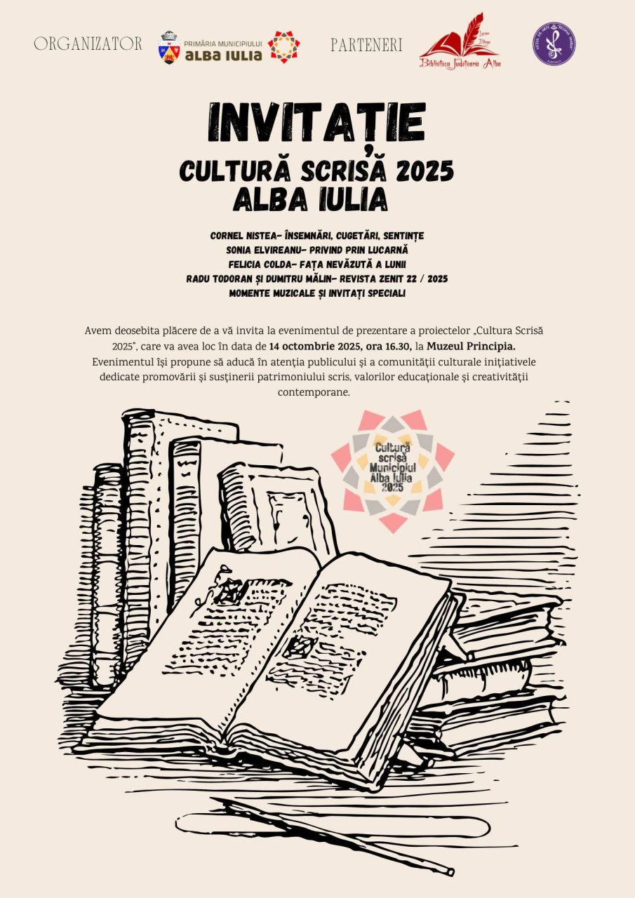 Marți, 14 octombrie 2025, ora 16.30, la Muzeul Principia are loc un eveniment dedicat prezentării proiectelor editoriale realizate în cadrul programului de finanțare „Cultura scrisă 2025” al Primăriei Alba Iulia.