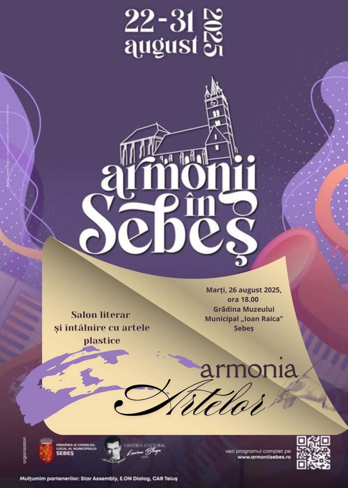 Marți, 26 august 2025, începând cu ora 18.00, Muzeul Municipal „Ioan Raica” Sebeș găzduiește, în spațiul grădinii interioare, evenimentul cultural „Armonia Artelor” – Salon literar și întâlnire cu artele plastice.