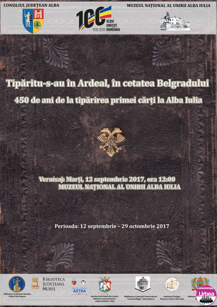 Marți, 12 septembrie 2017, orele 12:00, la Muzeul Național al Unirii Alba Iulia va fi vernisată expoziția: ”Tipăritu-s-au în Ardeal, în cetatea Belgradului. 450 de ani de la tipărirea primei cărți la Alba Iulia”.