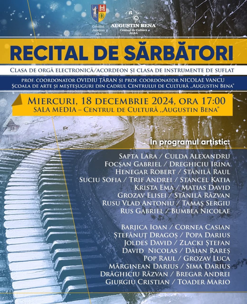 Miercur, ora 17:00 „Recital de Sărbători”, spectacol susținut de cursanții Școlii de arte și meșteșuguri a Centrului de Cultură „Augustin Bena” Alba Iulia