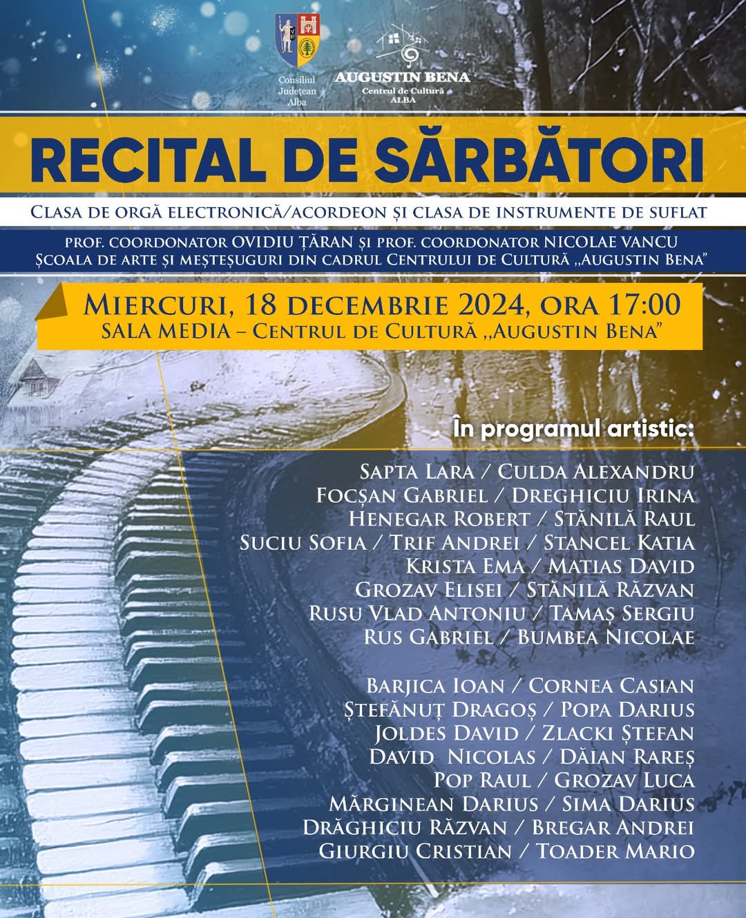 Miercuri, 18 decembrie 2024, de la ora 17:00, la SALA MEDIA a Centrului de Cultură ,,Augustin Bena” continuăm seria 𝐑𝐄𝐂𝐈𝐓𝐀𝐋𝐔𝐑𝐈𝐋𝐎𝐑 𝐃𝐄 𝐒𝐀𝐑𝐁𝐀𝐓𝐎𝐑𝐈,de această dată alături de cursanții claselor de orgă electronică/acordeon și instrumente de suflat din cadrul Școlii de arte și meșteșuguri a Centrului de Cultură ,,Augustin Bena”