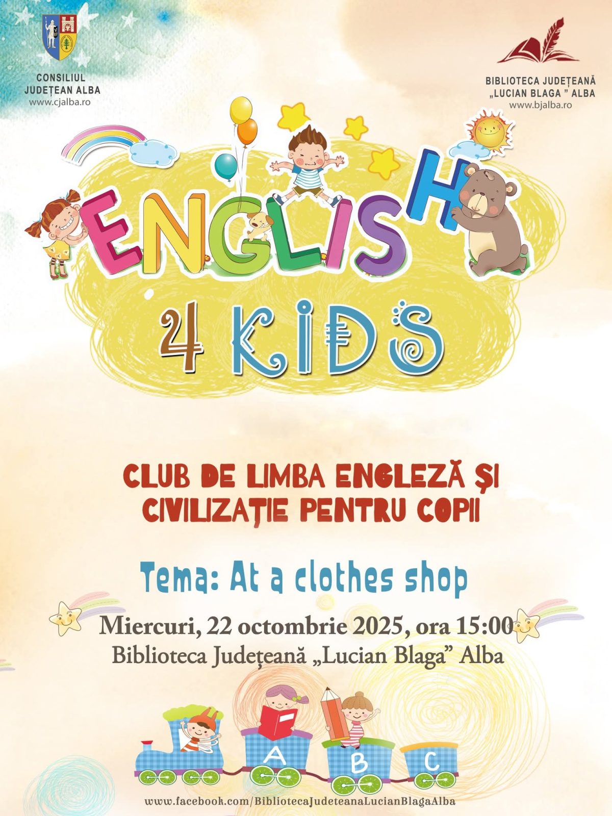 Miercuri, 22 octombrie 2025, de la ora 15:00 se va desfășura la Biblioteca Județeană „Lucian Blaga” Alba o nouă ediție a clubului de limbă și civilizație engleză pentru copii, intitulat „English 4 Kids”.