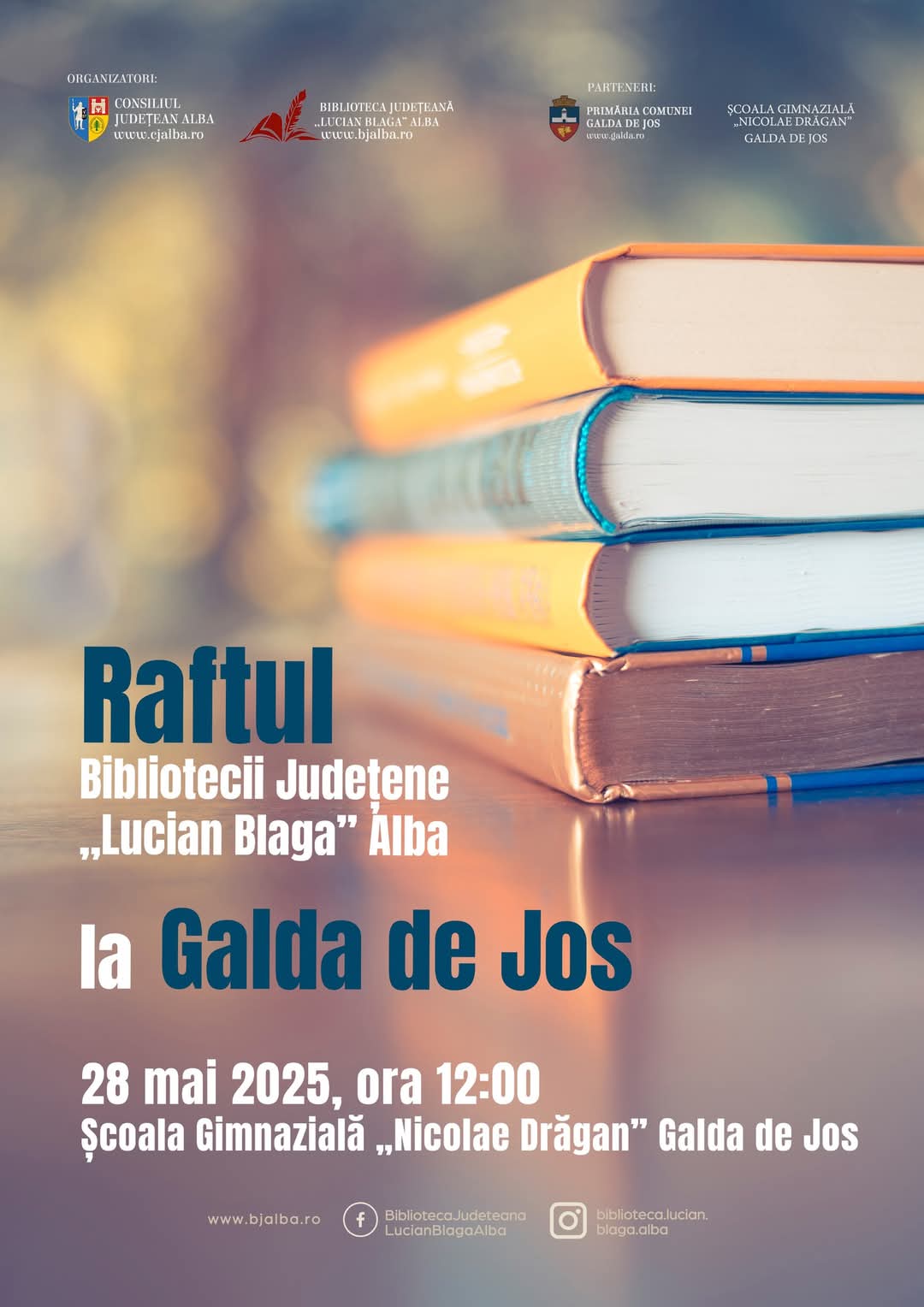 Cu prilejul inaugurării Raftului Bibliotecii Județene „Lucian Blaga” Alba la Galda de Jos, între biblioteca organizatoare și Primăria Comunei Galda de Jos se va semna un acord de parteneriat prin care cele două instituții se obligă să deruleze în următorii ani noi proiecte culturale pentru comunitate.