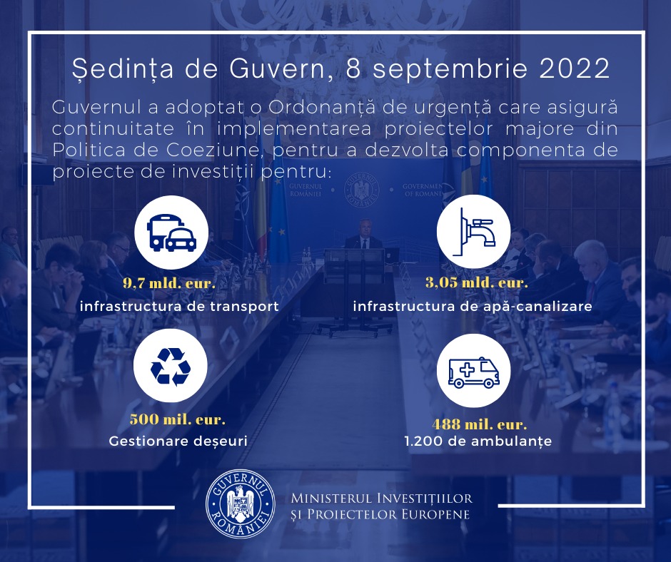 Guvernul României a aprobat în ședința de astăzi o Ordonanță de urgență prin care se stabilește cadrul legal pentru derularea fără întrerupere a proiectelor de infrastructură de transport, de dezvoltare a infrastructurii de management integrat al deșeurilor, dar și a infrastructurii de risc și de sănătate din perioada de programare 2021-2027.