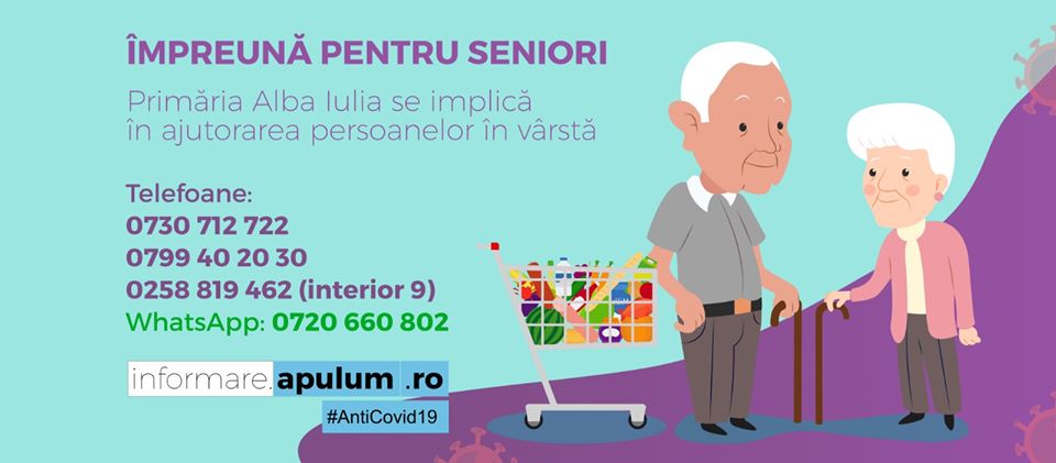 Seniorii orașului sunt cea mai vulnerabilă categorie în fața Covid-19. Perfect conștienți de acest lucru și în concordanță totală cu noile măsuri recomandate și instituite, la nivel național, prin Ordonanța Militară 2, reprezentanții Primăriei Alba Iulia și ai partenerilor voluntari vor livra, fiecăruia dintre cei care vor solicita acest lucru pe informare.apulum.ro sau la telefoanele de urgență 0730 712 722, 0799 40 20 30, 0258 819 462 (interior 9), pachete cu alimente de bază sau medicamente de care au nevoie albaiulienii în vârstă, pentru a putea trece cu bine peste perioada de izolare. Solicitarea de sprijin se comunică de luni până vineri între orele 09.00 -13.00, pentru a putea fi onorată în aceeași zi.