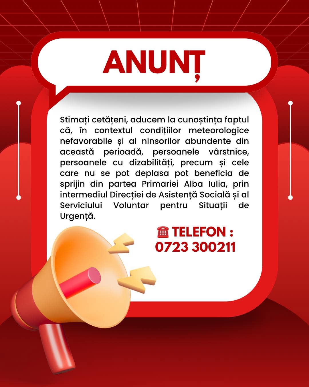 „Stimați cetățeni, aducem la cunoștința faptul că, în contextul condițiilor meteorologice nefavorabile și al ninsorilor abundente din această perioadă, persoanele vârstnice, persoanele cu dizabilități, precum și cele care nu se pot deplasa pot beneficia de sprijin din partea Primăriei Municipiului Alba Iulia, prin intermediul Direcției de Asistență Socială și al Serviciului Voluntar pentru Situații de Urgență, au anunțat, luni, reprezentanții adninistrației locale.