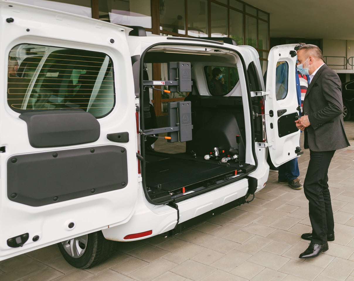 Autospeciala este echipată cu rampă de acces din aluminiu cu suprafață antiderapantă, pliabilă în interior cu blocare în două poziții, vertical și orizontal, sistem de siguranță și confort Future Safe cu sprijin lombar și cervical, fixare fotoliu rulant în patru puncte cu două centuri de siguranță retractabile în partea din față și două centuri cu tensionare în partea din spate, adaptare sistem electric pentru blocare/deblocare centuri de siguranță față pentru fotoliul rulant, centuri de siguranță în trei puncte pentru persoana transportată în fotoliul rulant, omologare RAR ca vehicul special cu posibilitate de configurare a locurilor, vehicul special pentru transportul a 5 persoane pe locurile originale sau 2 persoane pe locurile originale și o persoana în fotoliu rulant.