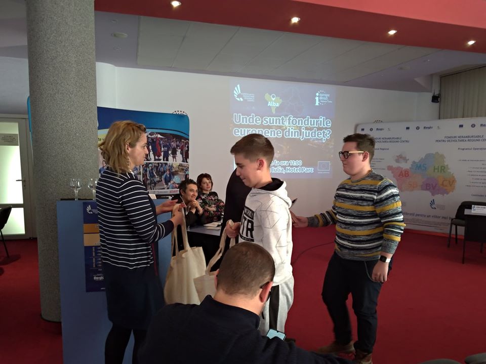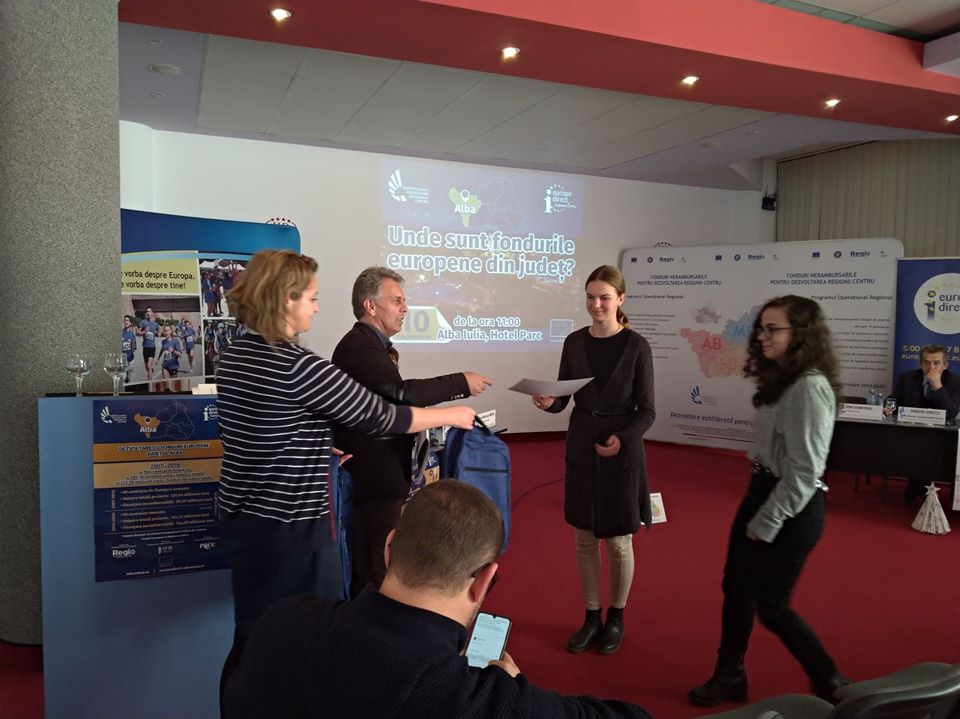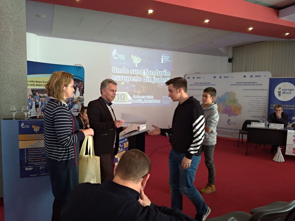 Cele mai muncite și mai bine realizate planșe/afișe au fost premiate pe 10 decembrie de către ADR Centru într-un cadru festiv, la sala de conferințe a Hotelului Parc. Coordonatorii proiectului sunt prof. Monica Fer Todoran – Colegiul Național HCC Alba Iulia și prof. Lavinia Dobra – Colegiul Economic DPM Alba Iulia, iar din echipa de implementare fac parte prof. Adrian Simion, prof. Opincariu-Mihinda Mihaela, prof. Amalia Furdui, precum și bibl. Lucreția Bîrz. Premiul I a fost obținut de echipa Petrea Ștefania și Buda Naomi de la Colegiul Național ”Horea Cloșca și Crișan” din Alba Iulia (coord. prof. Monica Fer Todoran), premiul al II-lea și al III-lea a fost primit de echipa Aciaiolli Erika și Conti Raul și respectiv, Beale Daniele și Indrei Alexandru de la Colegiul Economic ”Dionisie Pop Marțian” din Alba Iulia (coord. prof. Lavinia Dobra și prof. Adrian Simion). Din juriul proiectului au făcut parte prof. Opincariu Mihinda Mihaela, bibliotecar Bârz Lucreția ambele de la Colegiul Național HCC Alba Iulia precum și Mirela Groza și Nicolae Mărginean de la Agenția pentru Dezvoltare Regională Centru.