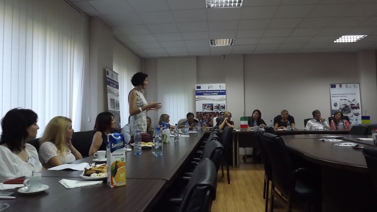 La Agenţia pentru Dezvoltare Regională Centru au fost prezentate delegaţiei italiene de către experţii agenţiei, Regiunea Centru, premisele şi potenţialul de dezvoltare al regiunii, experienţa în implementarea de proiecte transnaţionale, dar şi activităţile desfăşurate prin Centrul de informare Europe Direct. Acest schimb de informaţii a fost întregit de prezentările delegaţiei italiene care au vizat noile oportunităţi de finanţare 2014-2020 în cadrul Programului Erasmus+, cetăţenia europeană, comunicarea folosind mijloace media, fiind accentuată ideea conform căreia CREATIVITATEA este importantă pentru derularea proiectelor viitoare.