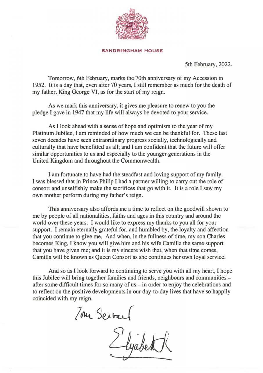 Regina a devenit primul monarh britanic care a serbat Jubileul de Platină (care marchează 70 de ani de domnie), moment în care și-a făcut cunoscute dorințele printr-un mesaj public adresat națiunii. În cele notate, a mărturisit că este „dorința ei sinceră” ca soția lui Charles, Camilla, să aibă acest titlu.