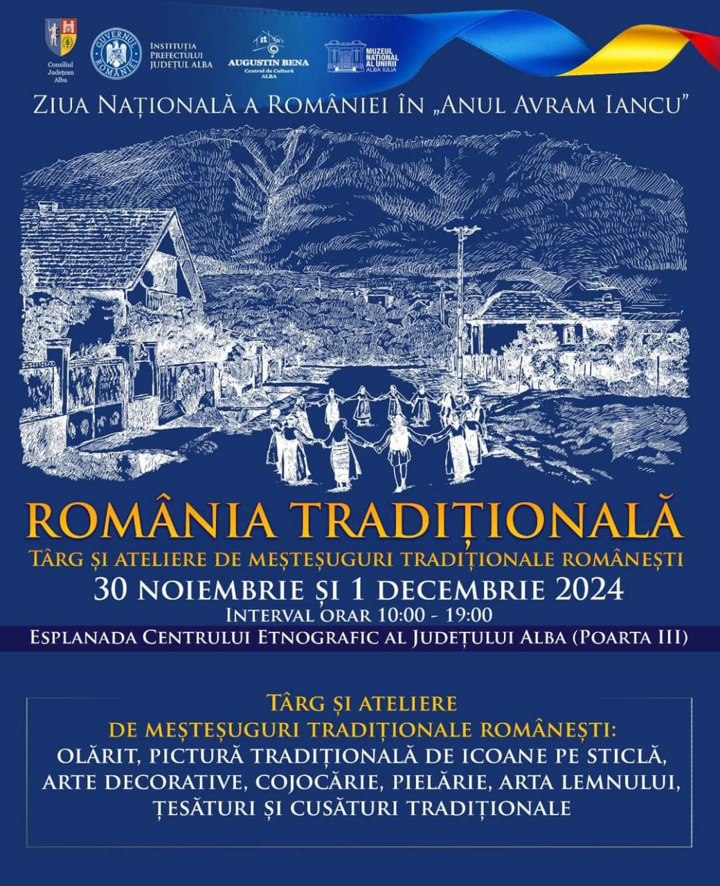 În cadrul proiectului Ziua Națională a României în ,,Anul Avram Iancu”, Consiliul Județean Alba și Centrul de Cultură „Augustin Bena” organizează un târg și o serie de ateliere dedicate meșteșugurilor tradiționale românești sub genericul ROMÂNIA TRADIȚIONALĂ.