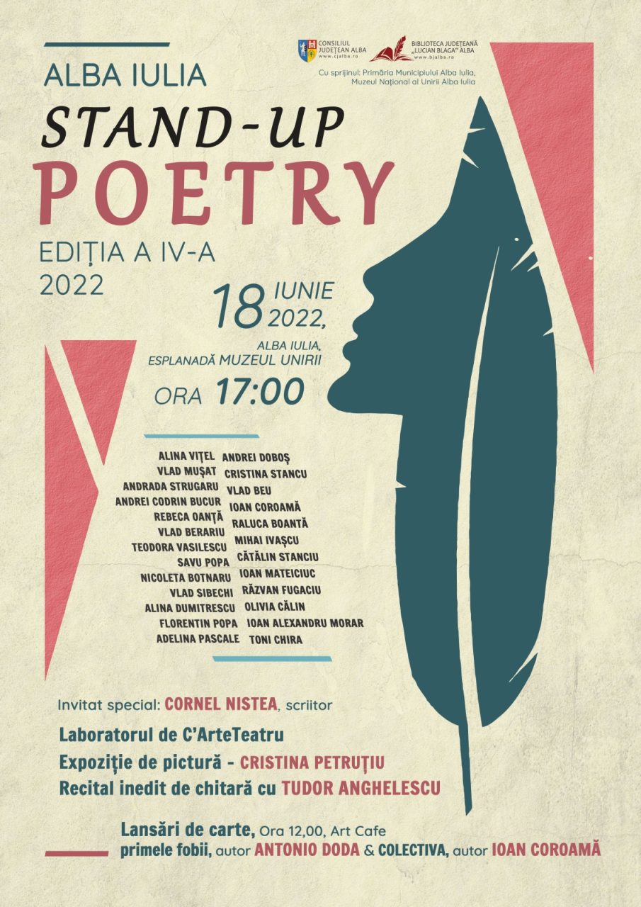 Sâmbătă, 18 iunie 2022, Alba Iulia devine capitala poeziei tinere, în cadrul celei de-a IV-a ediții a evenimentului Alba Iulia Stand-Up Poetry, organizat de Consiliul Județean Alba și Biblioteca Județeană „Lucian Blaga” Alba, cu sprijinul Primăriei Municipiului Alba Iulia și al Muzeului Național al Unirii din Alba Iulia.