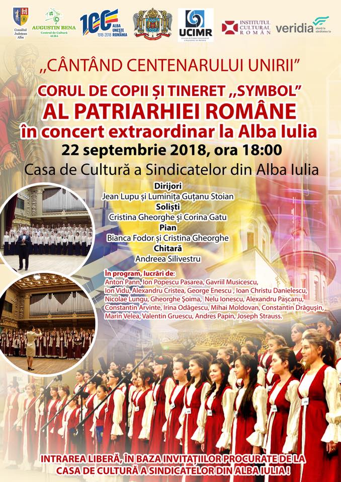 Corul de copii şi tineret „Symbol” al Patriarhiei Române susţine,  sâmbătă, 22 septembrie 2018, la Alba Iulia, un concert extraordinar dedicat Centenarului Marii Uniri. Evenimentul, denumit „Cântând Centenarului Unirii”, va avea loc pe scena Casei de Cultură a Sindicatelor din Alba Iulia, începând cu ora 18,00. Intrarea este LIBERĂ, în baza invitaţiilor care pot fi obţinute de la Casa de Cultură a Sindicatelor sau de la sediul Centrului de Cultură „Augustin Bena” Alba.
