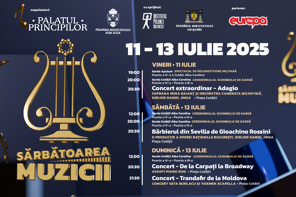 Sărbătoarea Muzicii este un eveniment global anual, iar Alba Iulia a fost primul oraș din România care a aderat la acest adevărat fenomen. De 12 ani, povestea continuă în fiecare vară, în inima Cetății Alba Carolina. Anul acesta, evenimentul este organizat de Primăria Municipiului Alba Iulia prin Centrul Cultural Palatul Principilor, cu sprijinul Primăriei Municipiului Chișinău și al Institutului Cultural Polonez din București. Partenerul media al evenimentului este rețeaua națională radio Europa FM.