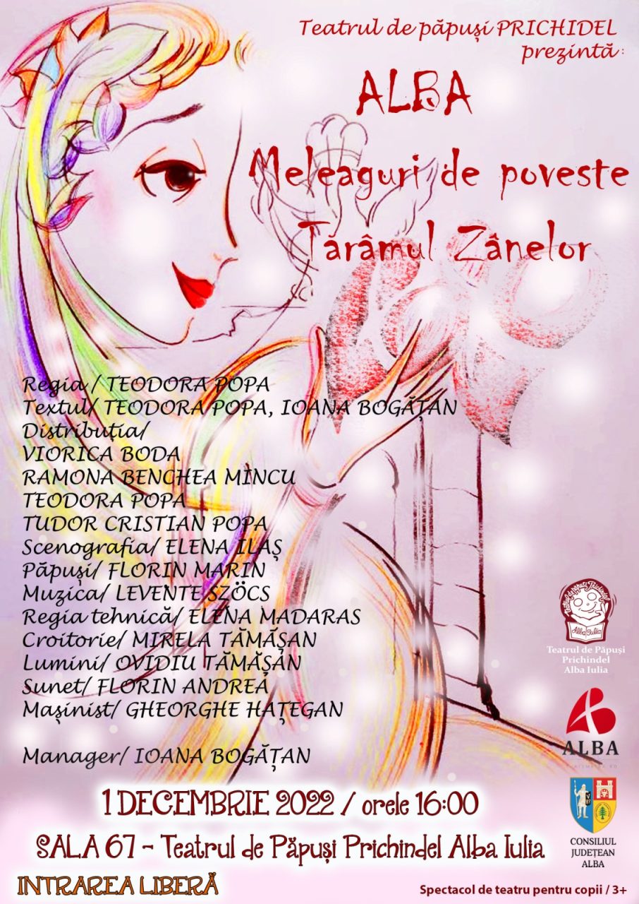 Teatrul de Păpuși „Prichindel”, vă invită joi, 1 Decembrie 2022, orele 16:00 la spectacolul Alba meleaguri de poveste – Tărâmul zânelor, la Sala 67 a Teatrului de Păpuși Prichindel din Alba Iulia. Ne bucurăm să fim parte din festivalul România tradițională, ediția 1, alături de Consiliul Județean Alba, Centrul de Cultură „Augustin Bena” Alba, Muzeul Național al Unirii Alba Iulia și Biblioteca Județeană „Lucian Blaga” Alba. Piesa pe care v-o propunem spre vizionare face parte din cadrul programului LABORATORUL DE TEATRU și prezintă copiilor istoria, legendele și obiectivele turistice interesante ale județului Alba.