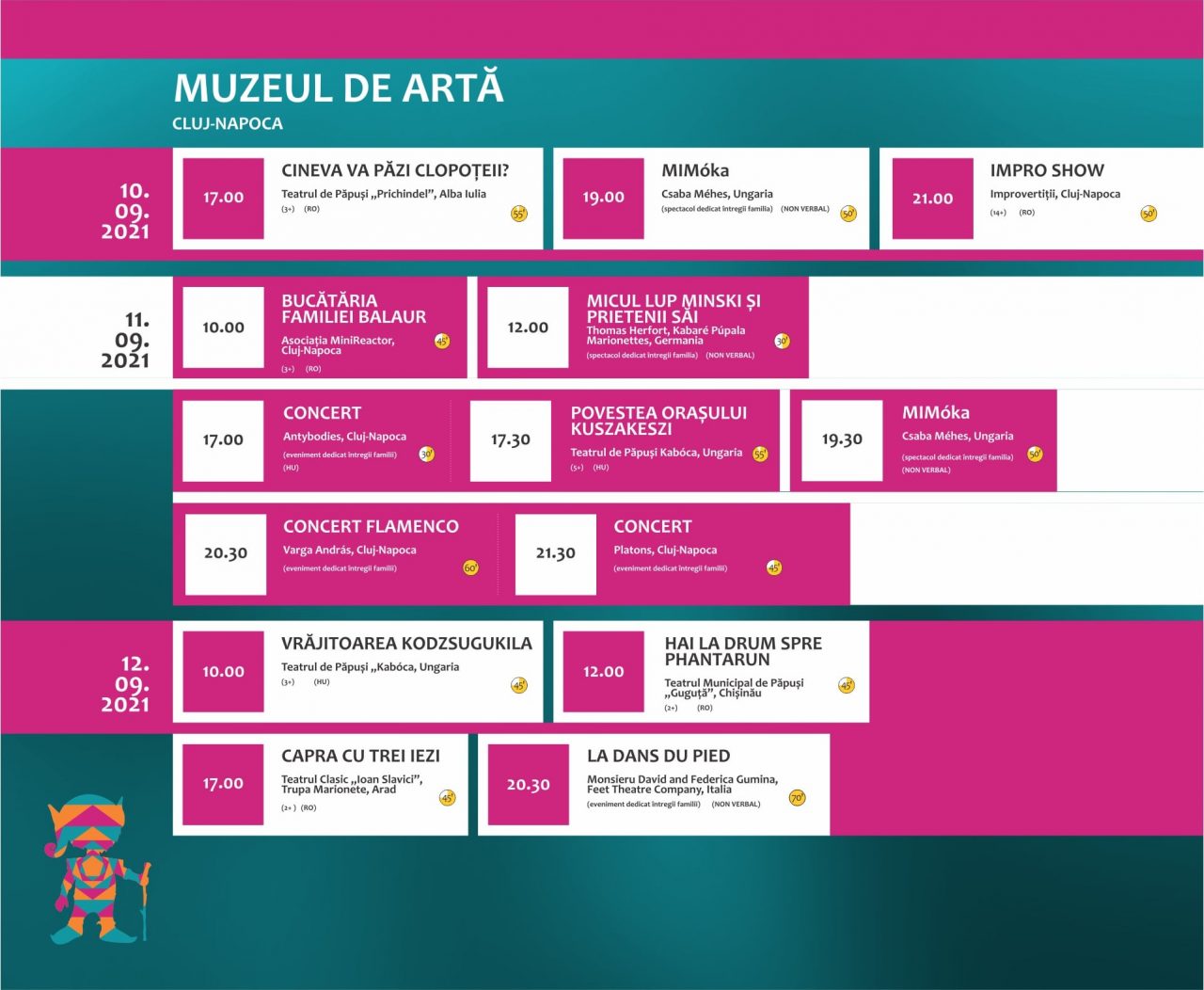 „Ne bucurăm să le oferim micilor spectatori clujeni un spectacol plin de culoare, vesel și atractiv – „Cine va păzi clopoțeii?”, regia Teodora Popa. Spectacolul va fi susținut în curtea Muzeului de Artă, vineri, 10 septembrie, de la orele 17:00.”,